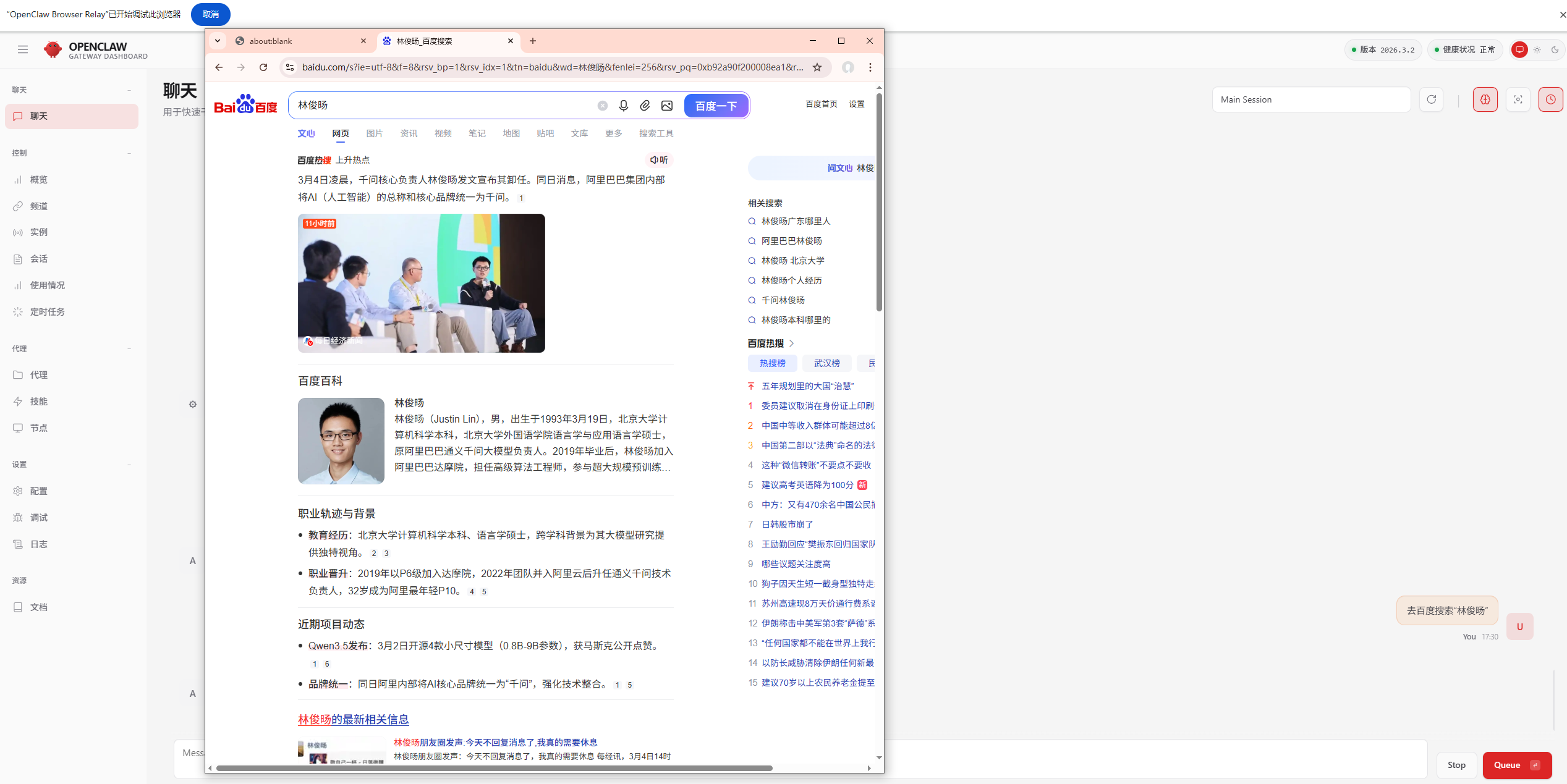除了可以直接在飞书这类聊天软件直接问外,还可以在OpenClaw控制台的聊天窗口使用,比如访问:http://127.0.0.1:18789/chat,在聊天窗中,让它帮我搜一下林俊旸的信息(阿里千问大模型团队技术负责人离职了,这两天各种流言,惋惜。。。)