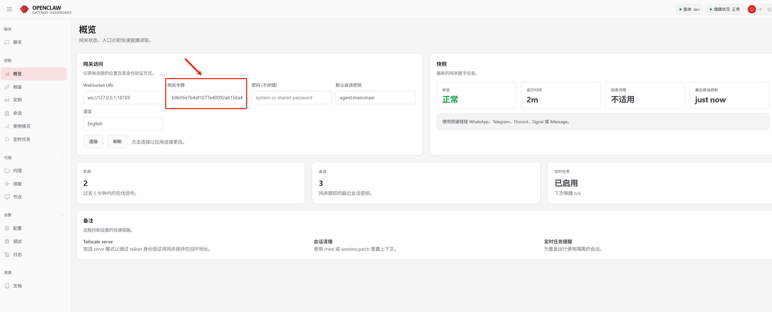 4)访问:http://127.0.0.1:18789/overview,获取网关令牌