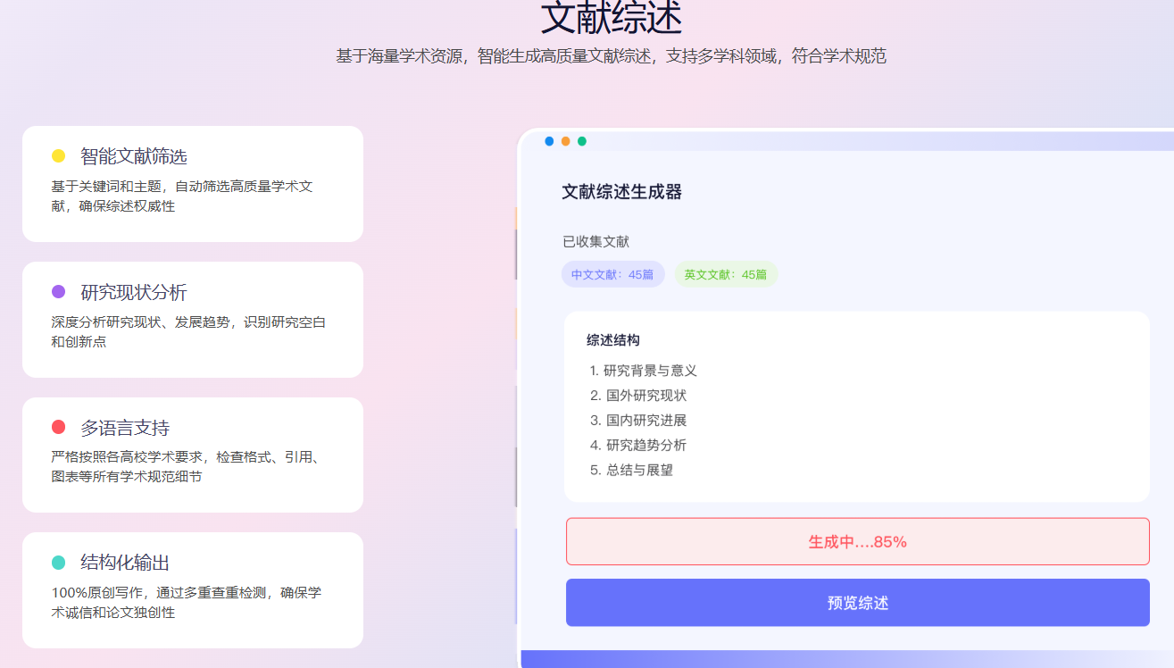 效率提升,回归本质: 将你从“找文献-读摘要-拼框架”的体力劳动中节省出大量时间,让你能将宝贵精力投入到更深入的思考、批判性分析以及个人观点的凝练上。