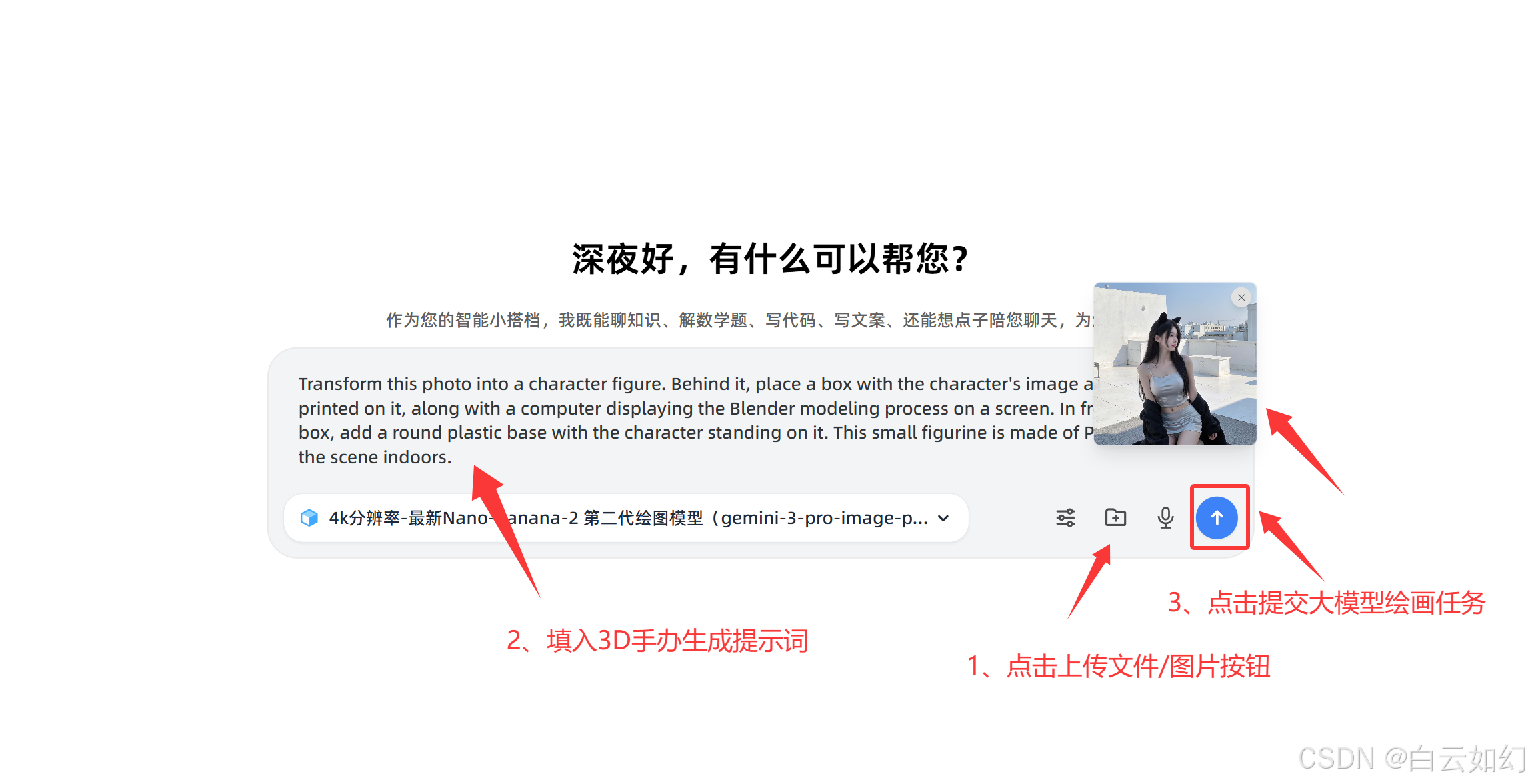 下面是一份 Nano Banana 使用指南,手把手带你做出同款 3D 手办图。文末附上我实测好用的提示词,直接套用就能出效果。