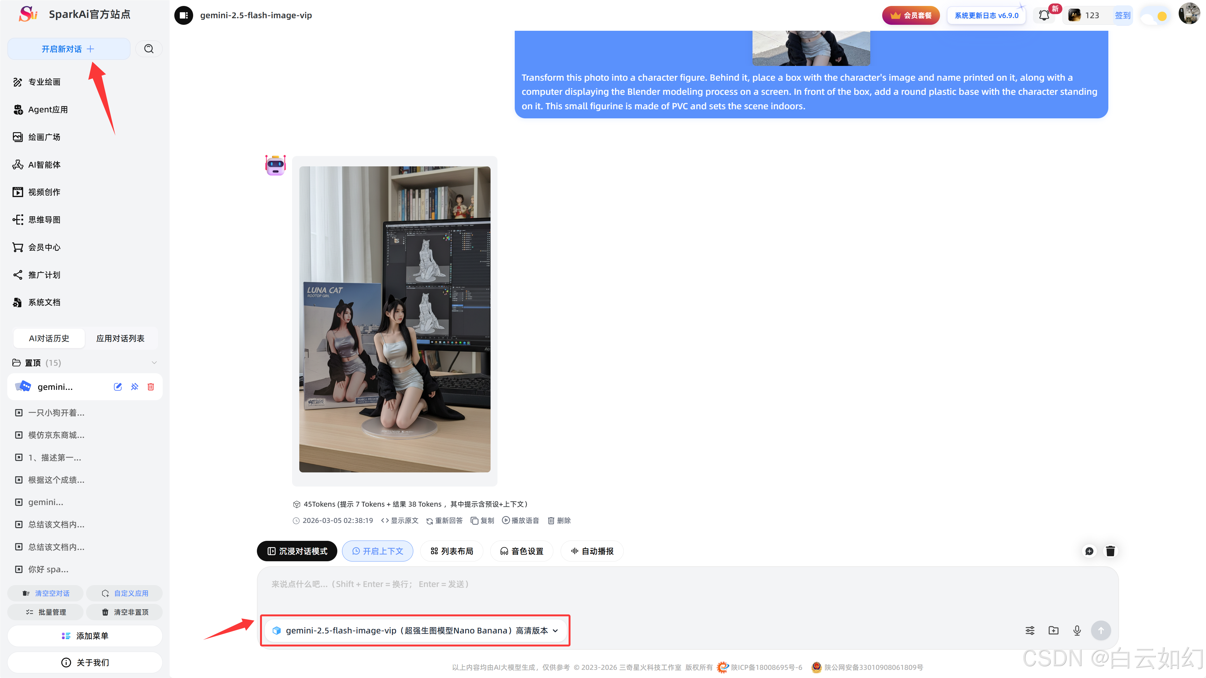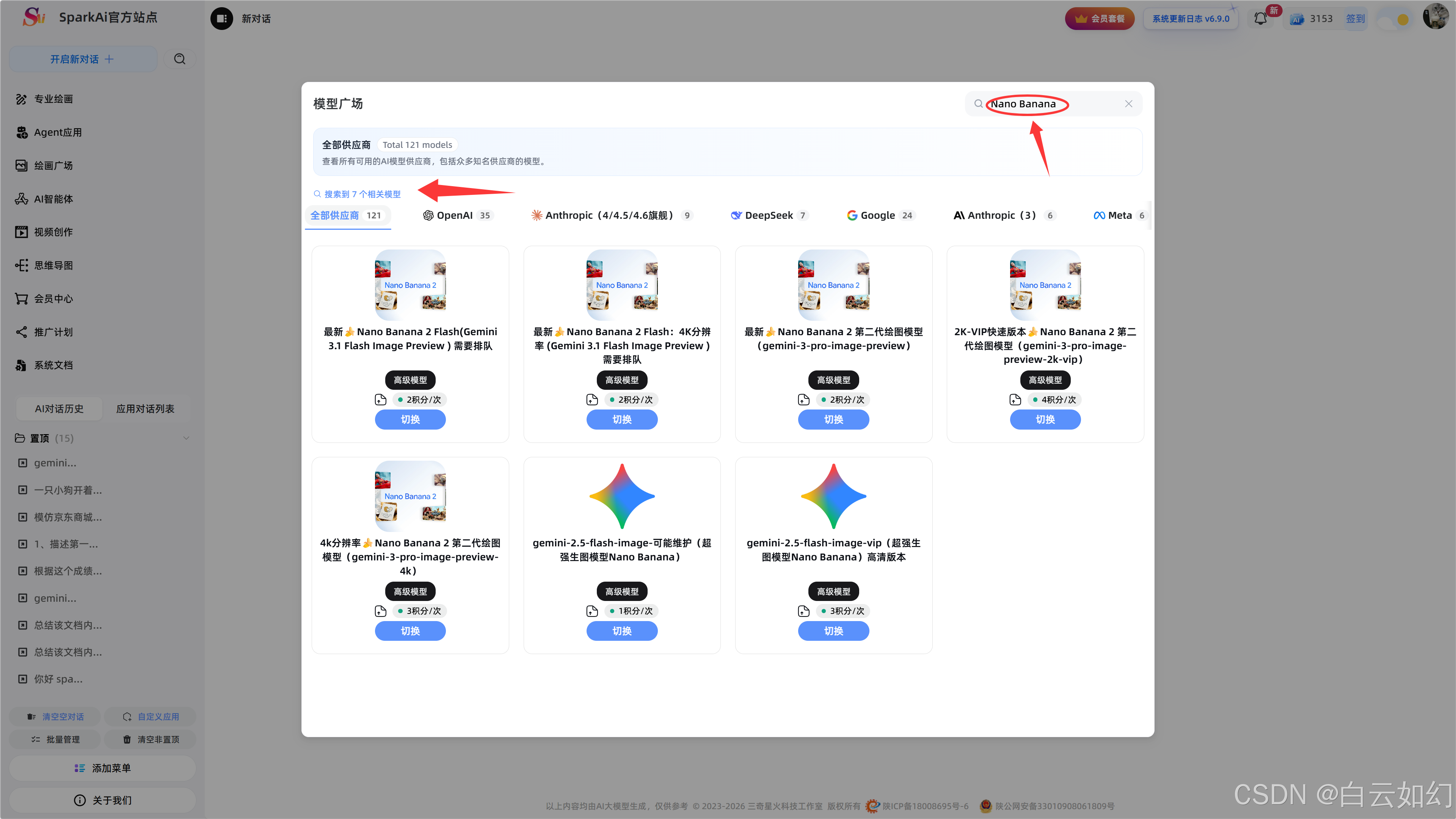 Nano Banana生图使用教程:点击对话聊天 -> 新建对话 -> 切换模型 -> 搜索或下滑模型列表 -> 选择Nano生图大模型