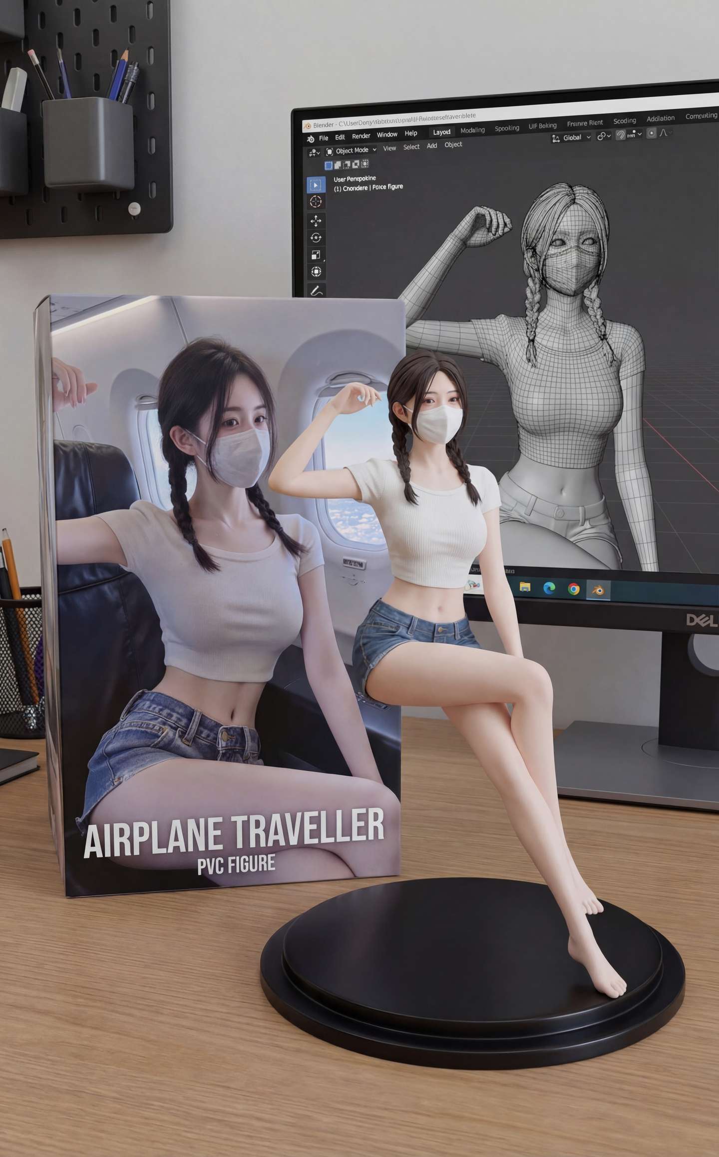 将这张照片转换成一个人物模型。在模型后面放置一个印有人物图像和名字的盒子,以及一台显示 Blender 建模过程的电脑。在盒子前面,放置一个圆形塑料底座,人物站在底座上。这个小模型由 PVC 制成,用于室内场景的布置。