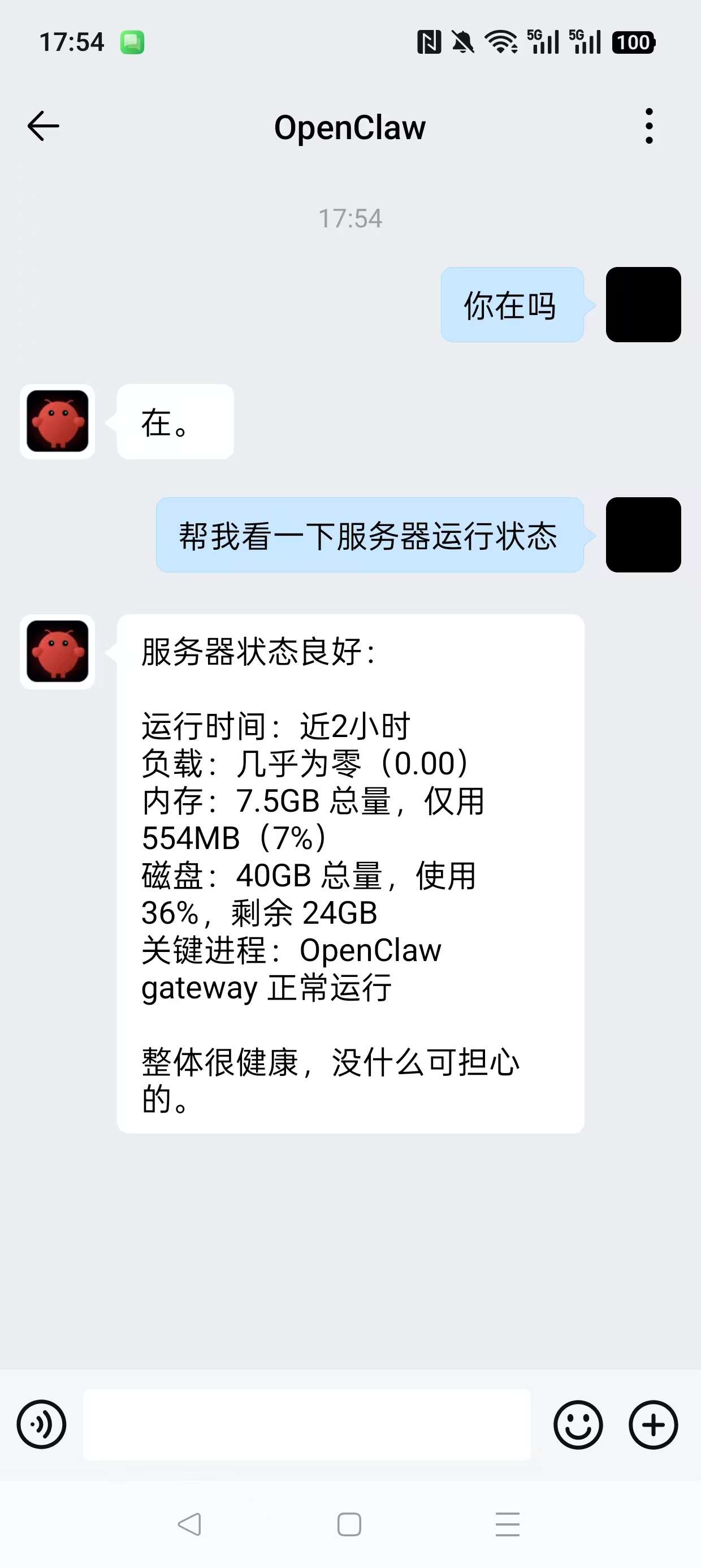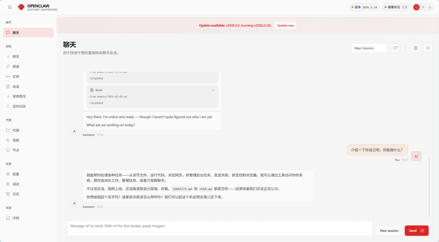 然后,我们就可以通过下面的网址访问OpenClaw了,注意不要暴露你的公网地址和token,否则会有风险