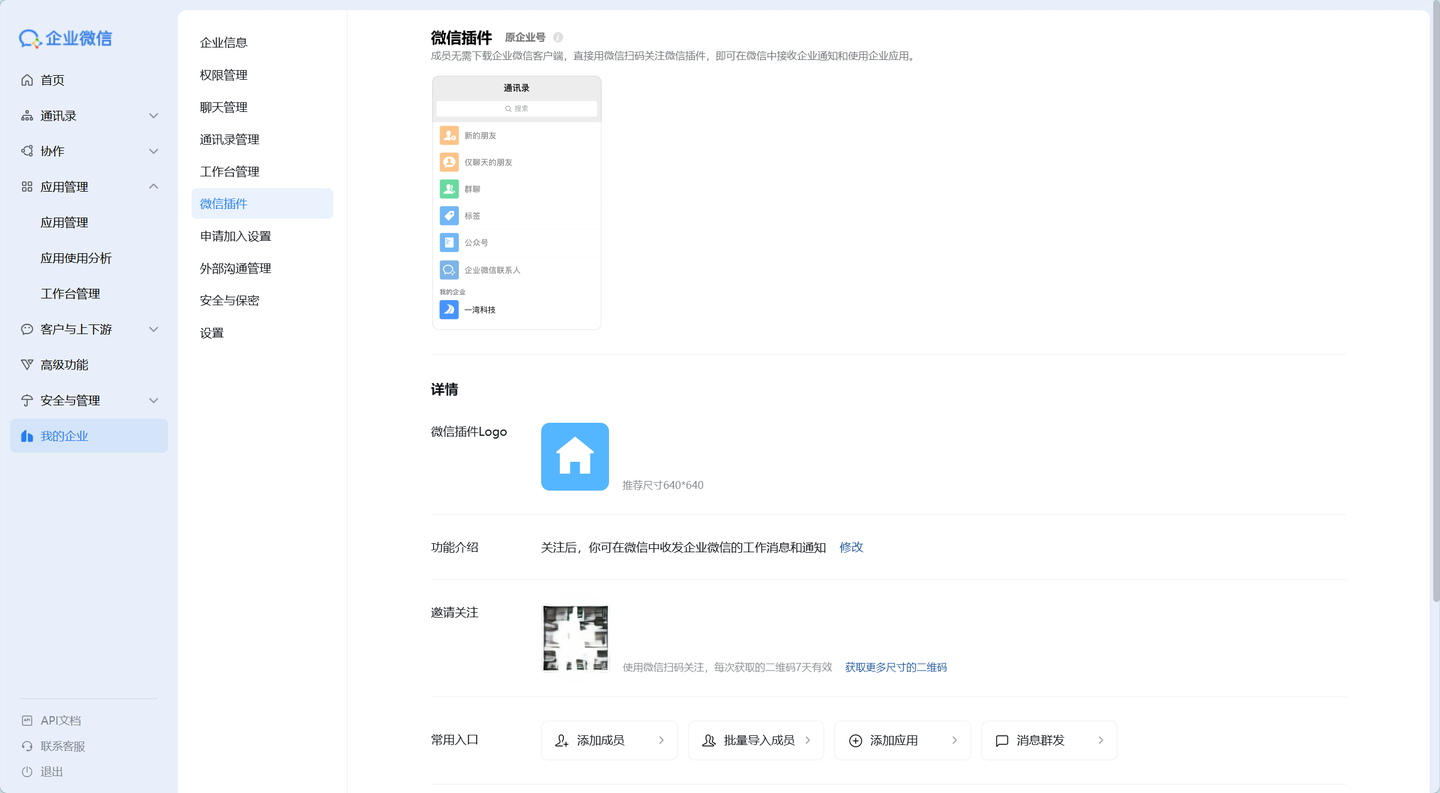 回到企业微信后台的「我的企业」设置下的微信插件