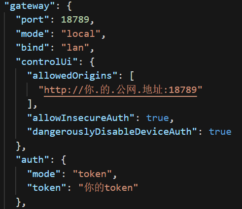 打开OpenClaw目录下的openclaw.json,找到geteway这里,将bind改为lan,allowedOrigins里填入你的公网地址,加入allowInsecureAuth和dangerouslyDisableDeviceAuth两个选项为true,auth里设置Dashboard的token(如果已自动设置,可以跳过)