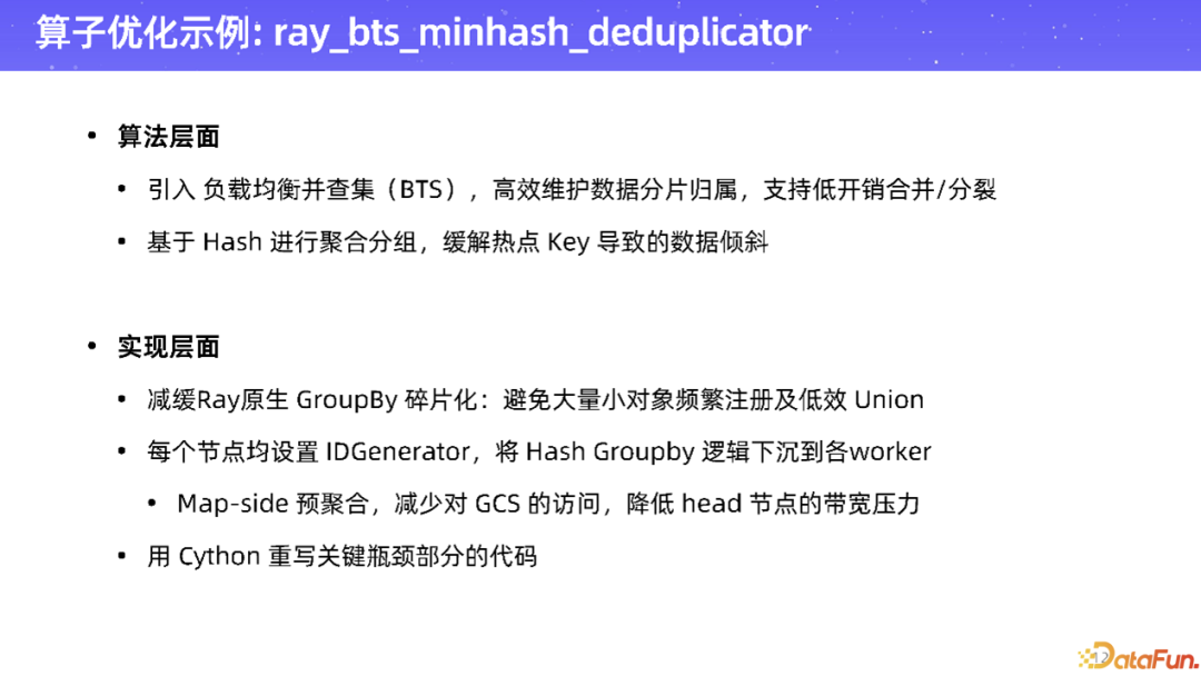 ray_bts_minhash_deduplicator****是 DataJuicer 针对大规模去重场景设计的高性能算子,通过 算法创新与实现层优化 克服 Ray 原生 GroupBy 的瓶颈。该算子融合负载均衡查集(BTS)、Hash 分组与 Map-side 预聚合技术,显著降低通信开销与 head 节点压力。