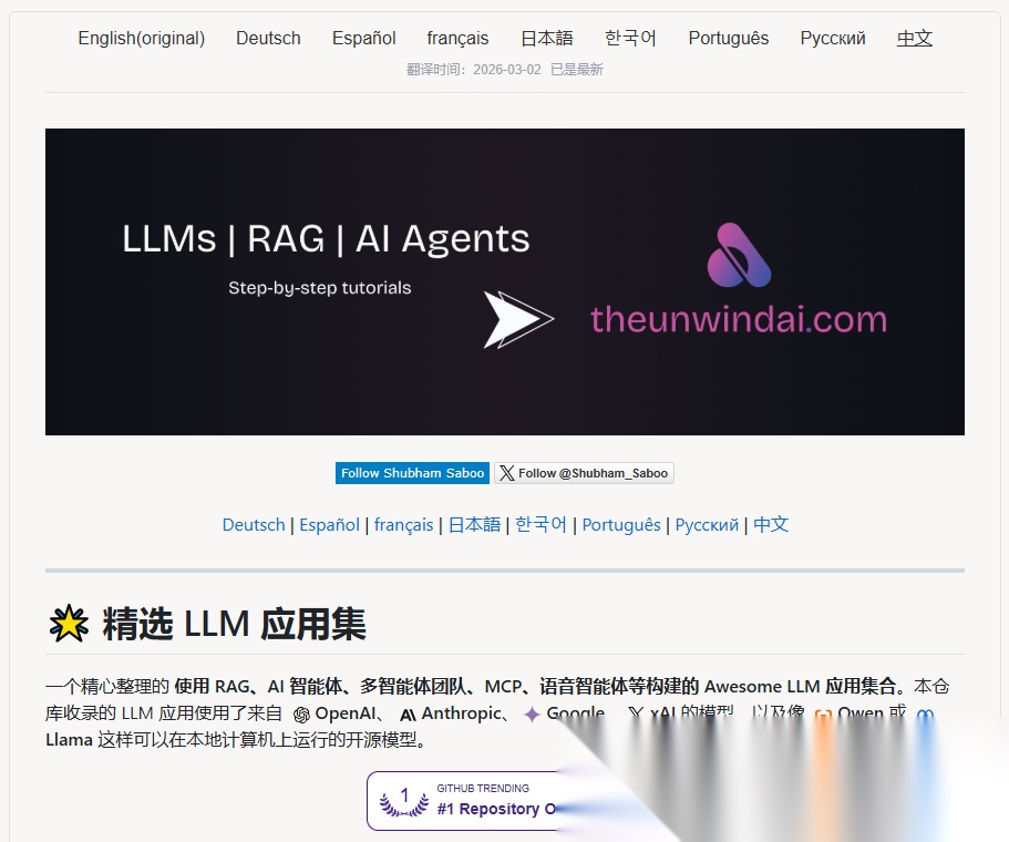 - 核心定位:精选 LLM 应用集合,从入门到实战
