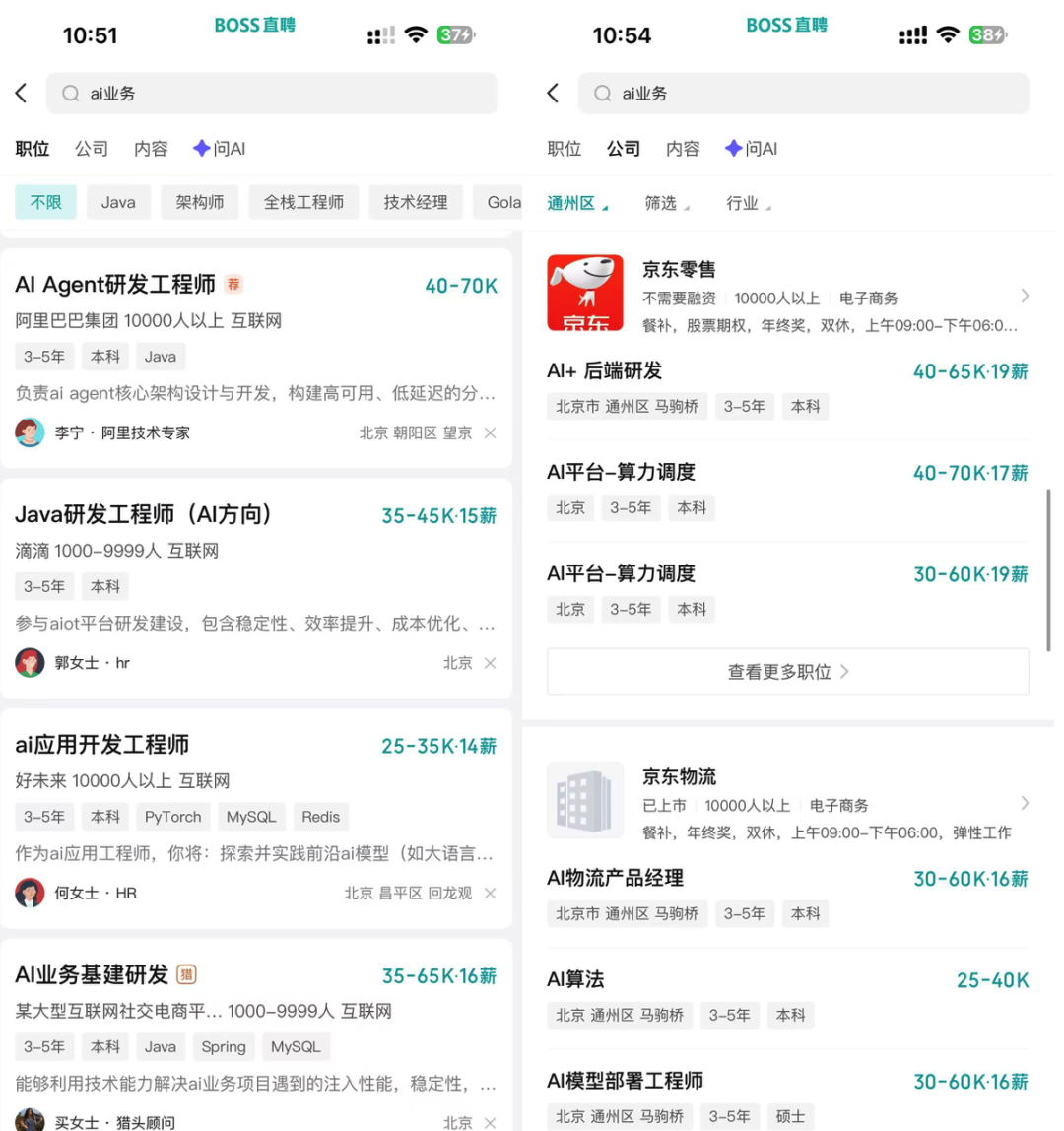 所以,公司里目前大量的业务场景,都开始做相关业务类型的智能体服务,也因此有了非常多的 AI Agent 智能体岗位。当你在Boss直聘,检索这些岗位后,就会知道他们都在哪些场景落地了(AI Agent + 业务)。