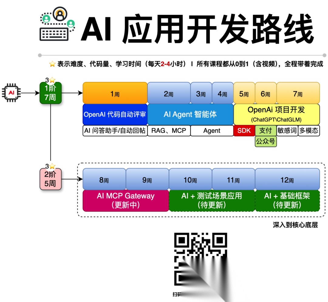 - 时间充足;可以从 OpenAI 代码自动评审开始,之后到 AI Agent 智能体,再到 OpenAI 项目开发。后面可以跟随二阶段项目。