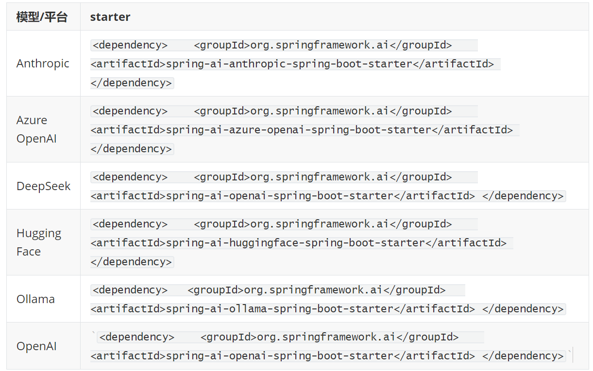 SpringAI完全适配了SpringBoot的自动装配功能,而且给不同的大模型提供了不同的starter,比如: