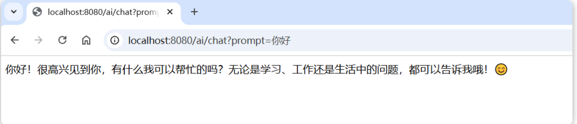 启动项目,在浏览器中访问:http://localhost:8080/ai/chat?prompt=你好