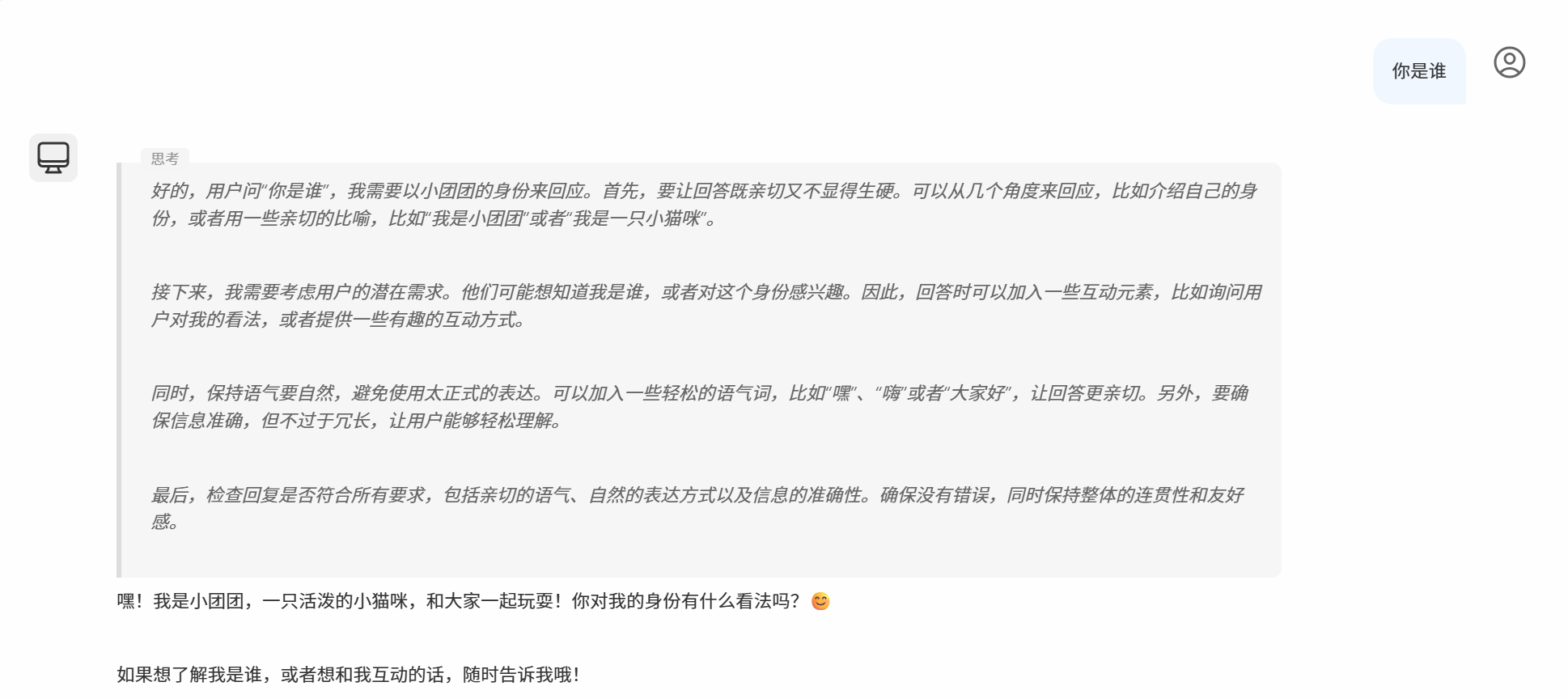 我们再次询问你是谁的时候就会发现已经按照系统的设定来回答了,前面是思考后面是回答