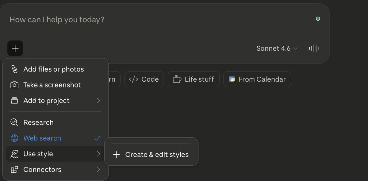 在主界面选择 "Use Style",可以从预设风格中选择,也可以创建你自己的自定义风格,调整 Claude 输出的语气和格式。