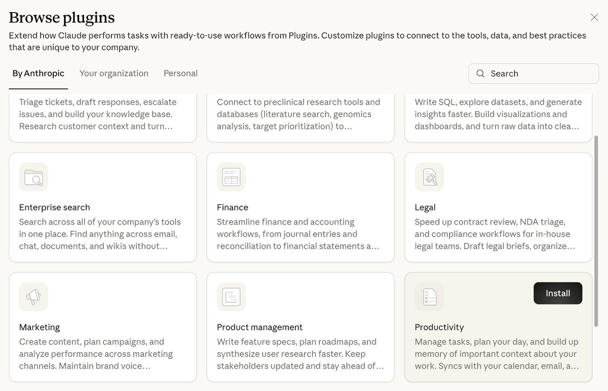 Anthropic 已经做好了 10 多个 Plug-in,覆盖法务、营销、财务等方向,现在就可以用。