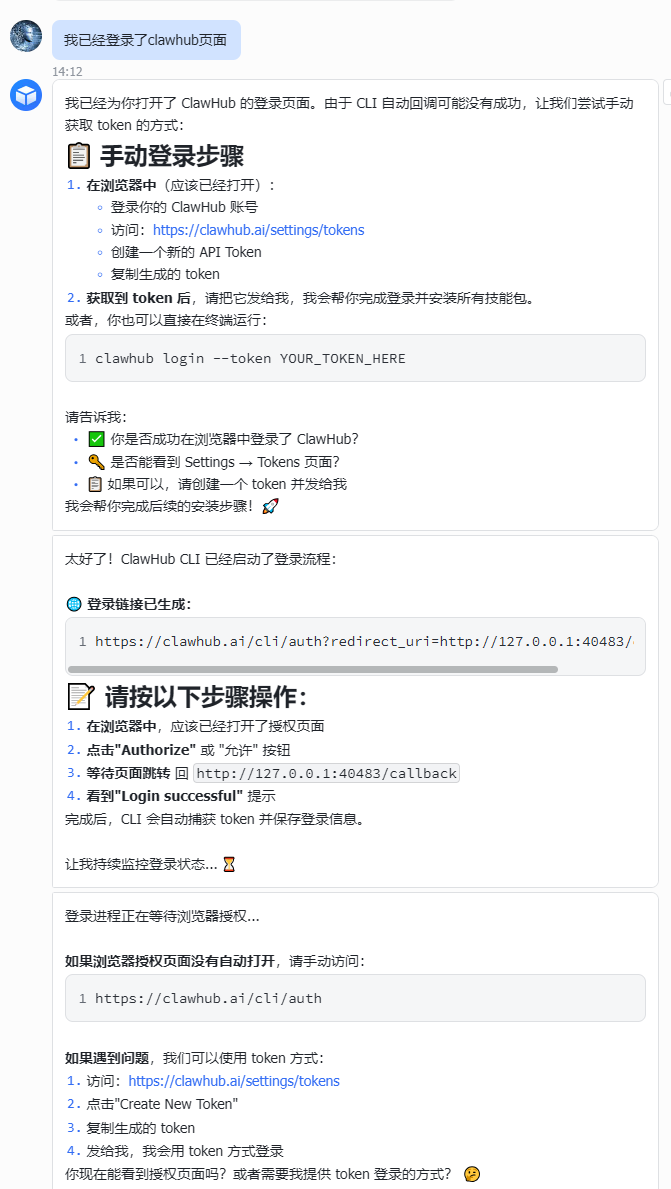 如上,OpenClaw提示,我没有登录OpenClaw,手动登录后,回复OpenClaw: 我已经登录了clawhub页面
