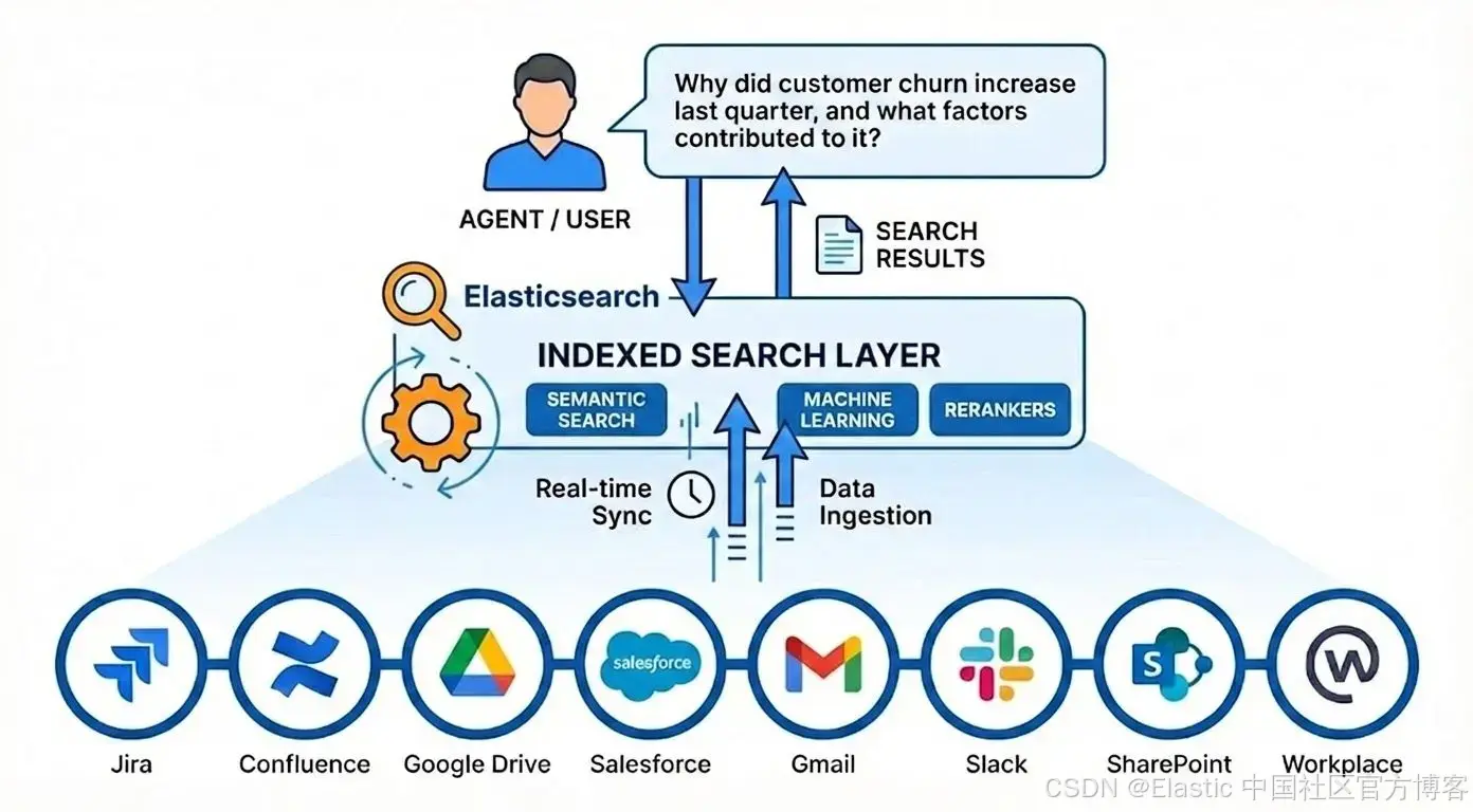 例如,agent 不必独立从 CRM、工单和文档系统中拉取数据,并实时调和客户 ID、时间戳和格式;Elasticsearch 可以将这些来源预先索引为统一的客户交互索引,支持混合(关键词 + 向量)搜索和相关性排序。然后 agent 查询单一、一致的接口,并立即在最相关的上下文上进行推理。