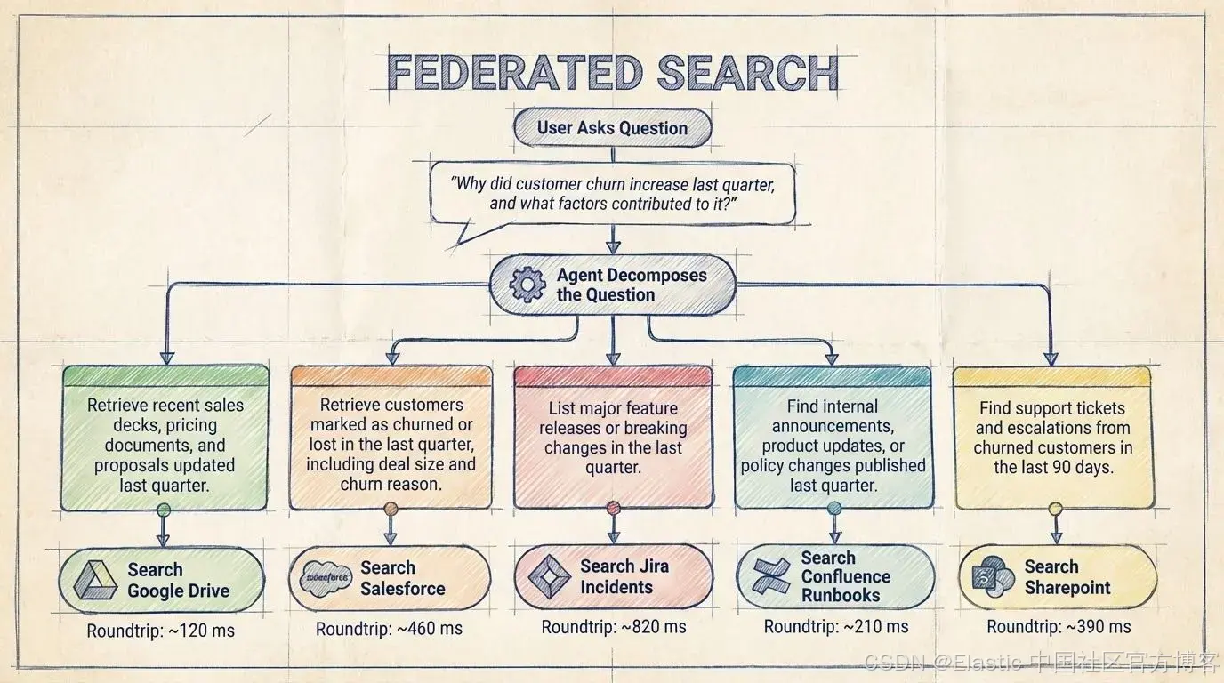 这一区别至关重要,因为一旦基于 MCP 的 agent 开始从多个工具实时拉取信息,它们就在新名称下重现了一个熟悉的模式:联合搜索 (federated search)。