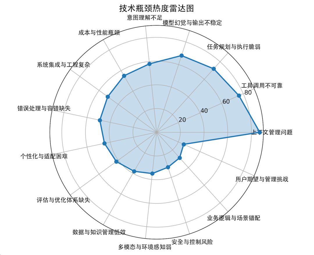 前5大瓶颈基本集中在模型内在能力与协作机制;6-10位更多是工程与成本问题;而末尾的痛点则涉及业务适配和安全合规。