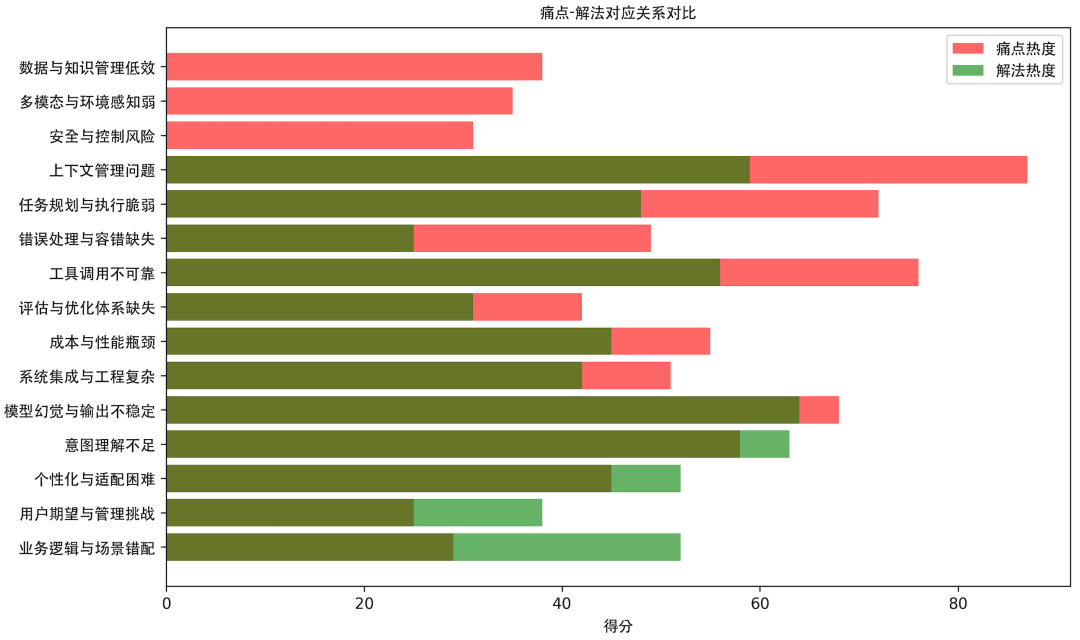 - Agent落地面临严重的"方案缺位"问题。差值+20以上的7个痛点中,有3个完全没有对应解决方案,4个方案热度严重不足。最大的矛盾是上下文管理作为87分的最高痛点,却只有59分的方案关注度。