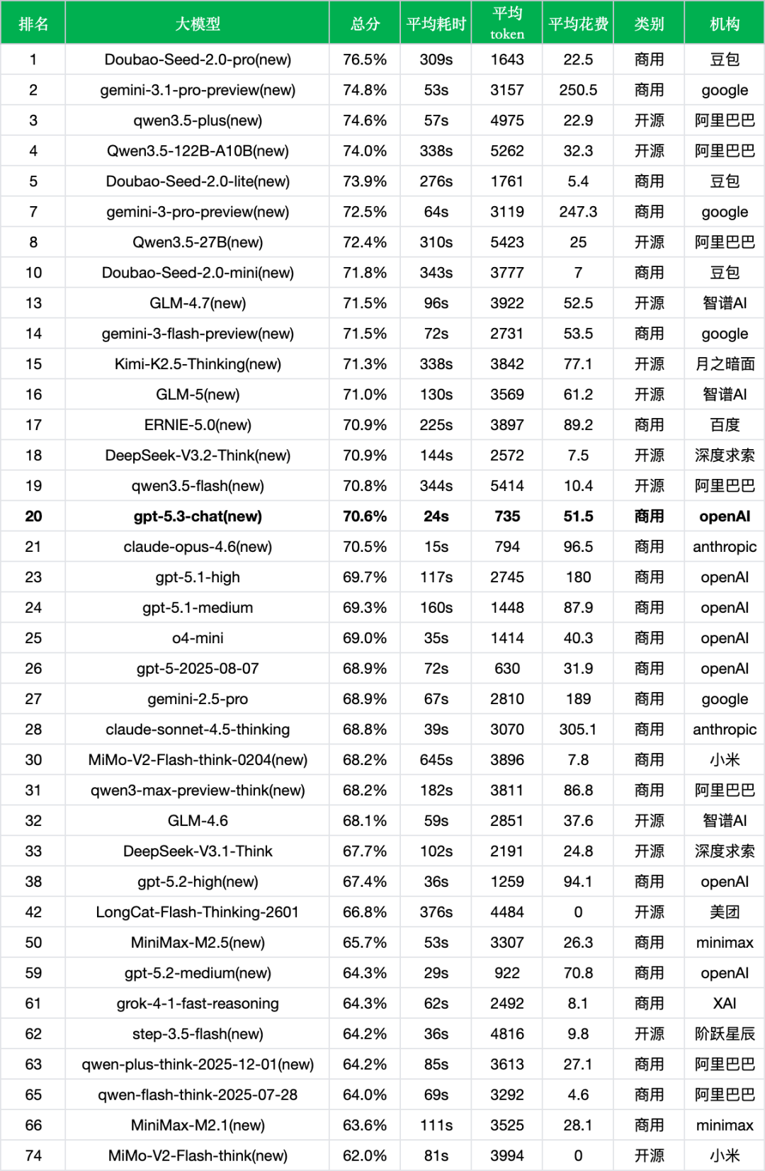 - 对比其他厂商的新模型:gpt-5.3-chat(70.6%)与GLM-4.7(71.5%)、gemini-3-flash-preview(71.5%)基本处于同一水平线,但与榜首的Doubao-Seed-2.0-pro(76.5%)和第二名gemini-3.1-pro-preview(74.8%)仍有一定差距。