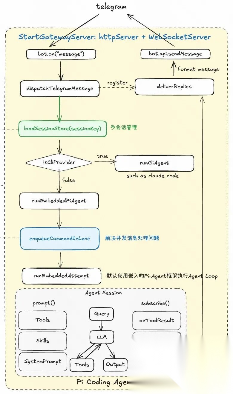 下图以Telegram为例,说明从收到消息,到运行Agent,最后回调发送消息的一次核心运行流程。