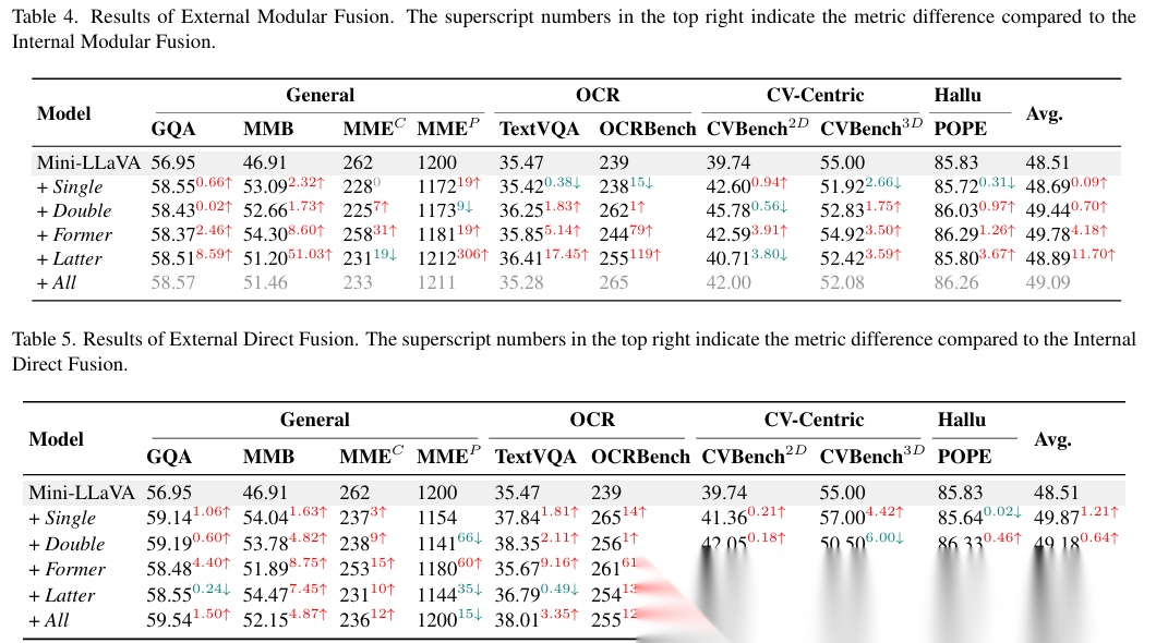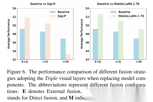 在更强视觉编码器(SigLIP)和更大语言模型下,外部直接融合依然保持领先,验证方法的可扩展性。
