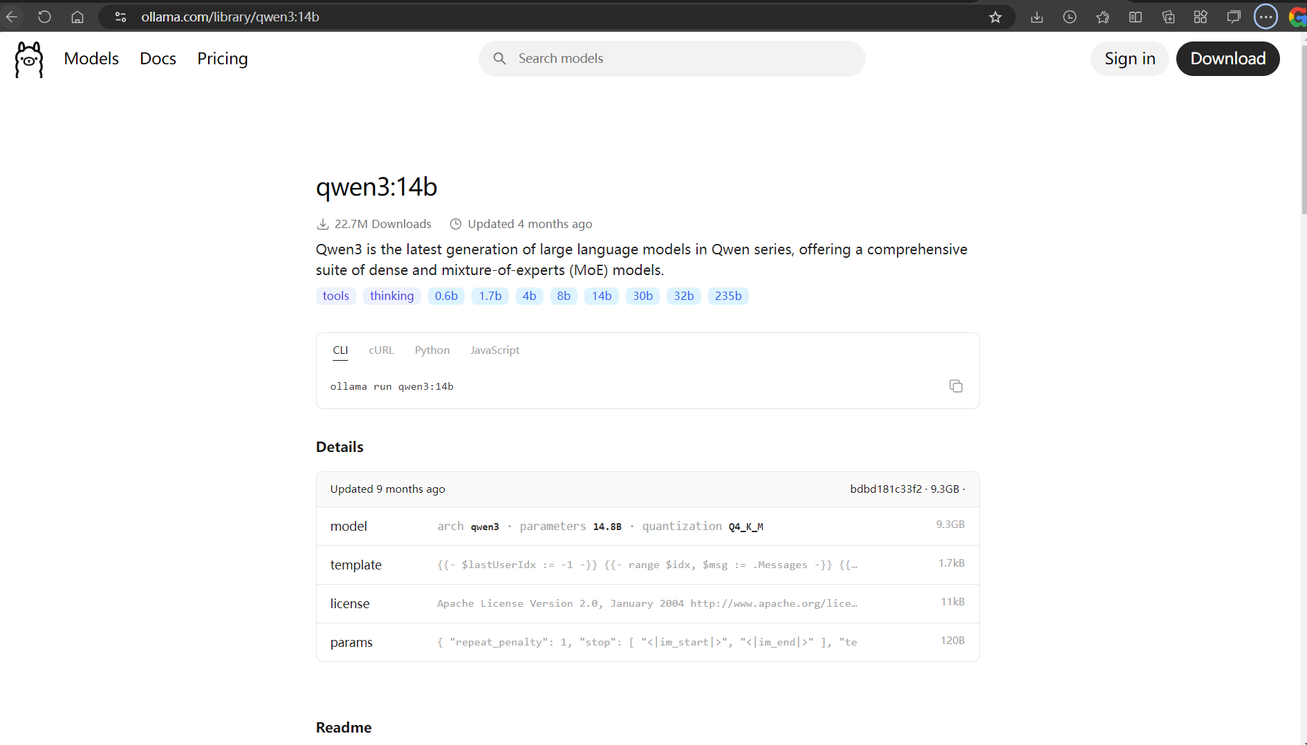 6.进入ollama官网,选择模型,在模型列表中选择所需的模型,随后在终端中执行对应的 CLI 命令以拉取并运行该模型。我这里选择的是qwen3:14。