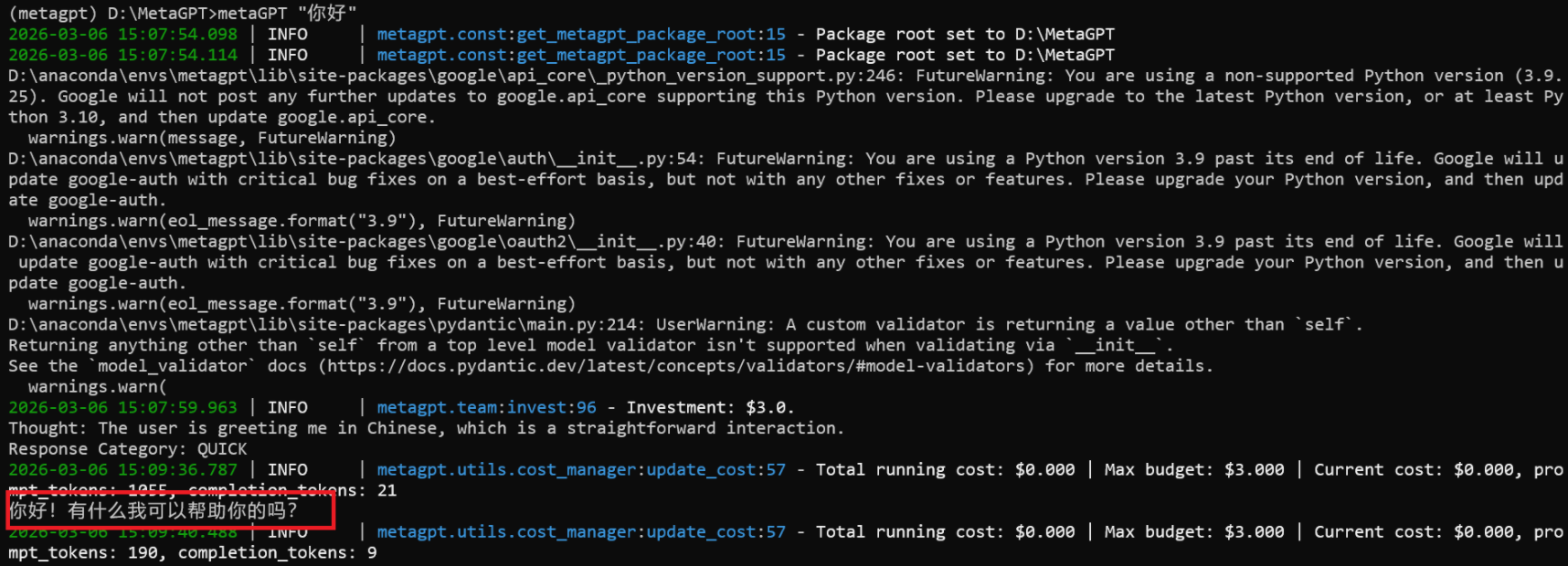6.终端输入:metagpt "你好"