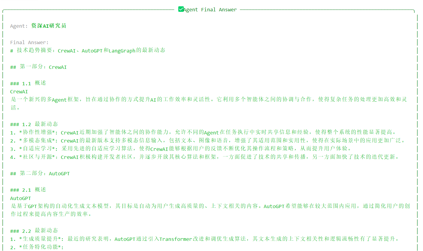 description="调研CrewAI、AutoGPT、LangGraph最新动态",