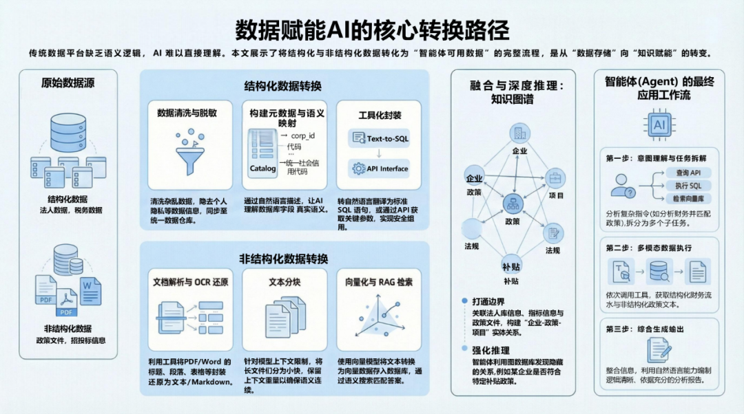 因此要让智能体(Agent)使用这些数据,必须经过一系列的转换。根据数据类型的不同,转换路径也不通,主要分为结构化数据(人口、法人这类数据)和非结构化数据(例如政府侧政策文件)。
