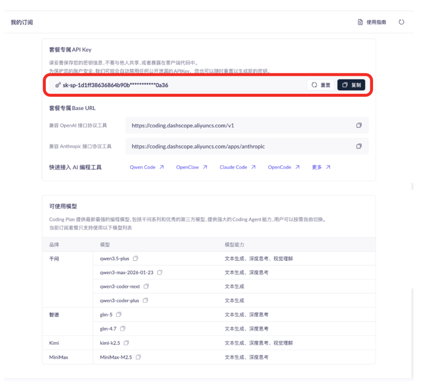 生成专属 API Key:在 Lite 基础套餐页面,点击「生成」按钮获取套餐专属 API Key,需妥善保存,切勿共享或暴露在客户端代码中,可随时重置密钥。
