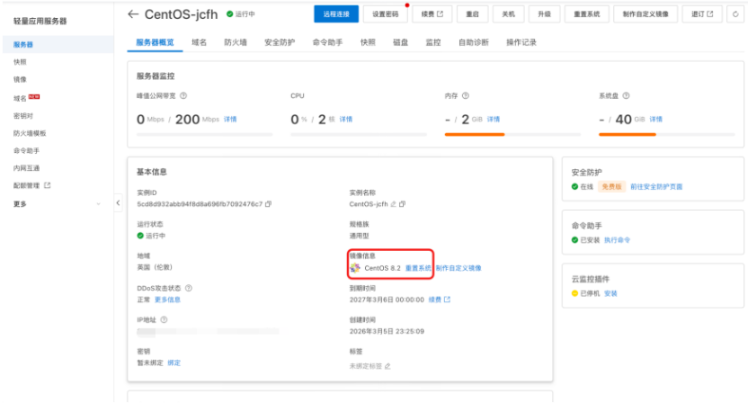配置资源:2 核 CPU、2GB 内存(示例占用 0.89GiB)、40GB 系统盘(示例占用 16.89GiB)、200Mbps 峰值带宽