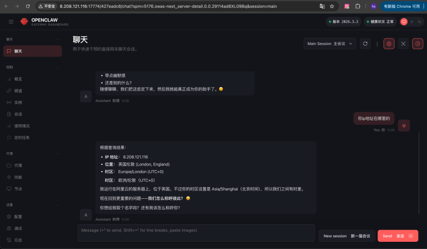 打开浏览器访问该地址,进入 OpenClaw WebUI 界面。