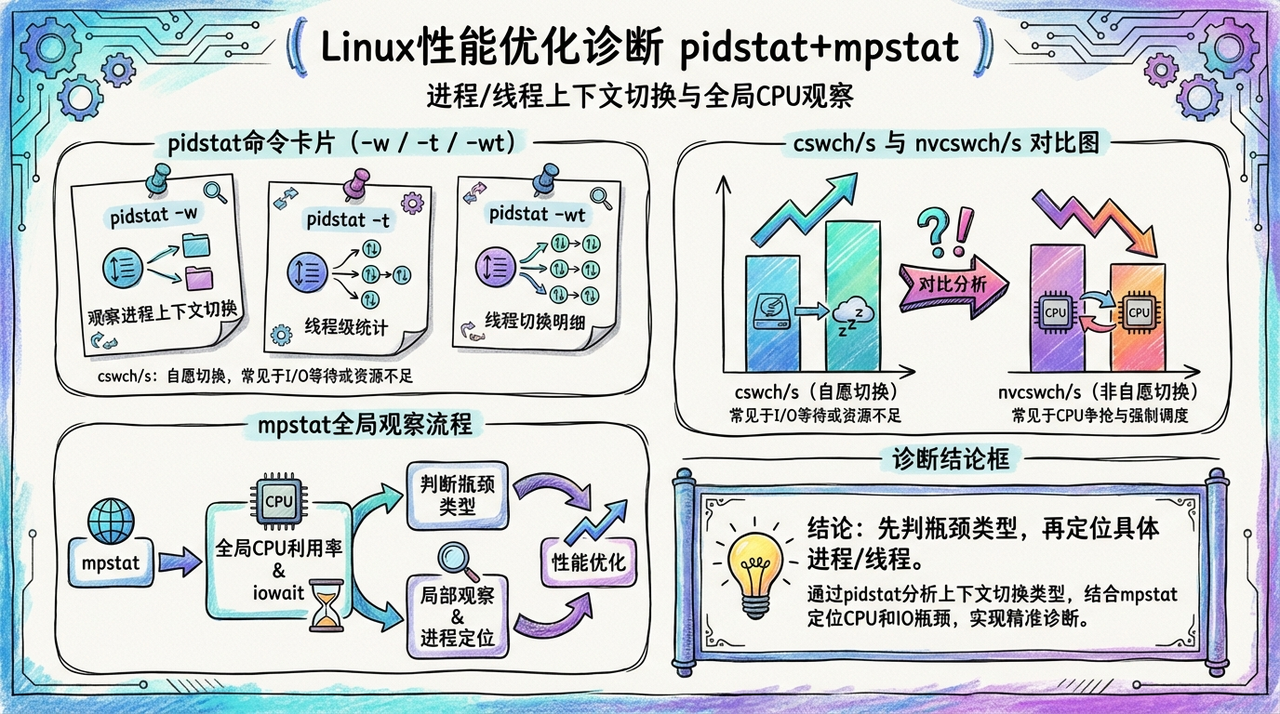 摘要:本文介绍了Linux系统性能优化中常用的诊断工具pidstat和mpstat的使用方法。pidstat命令可监控进程上下文切换情况,包括自愿(cswch/s)和非自愿(nvcswch/s)切换,以及线程统计信息。vmstat命令用于全局系统监控,可查看CPU队列、内存、I/O等指标。文章通过案例演示如何分析CPU上下文切换问题,包括使用sysbench模拟高负载场景,结合uptime、mps