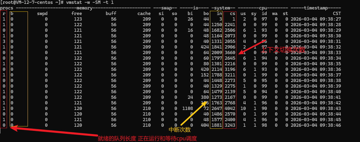 vmstat -w 1查看变化的 CPU 队列情况、内存、I/O、上下文切换、系统中断次数、CPU 使用率等等-