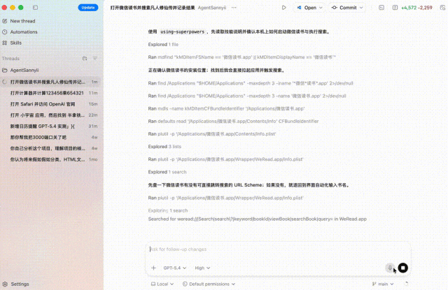 几乎你电脑上任何 APP,都可以被 GPT-5.4 所调用,比如打开微信读书。