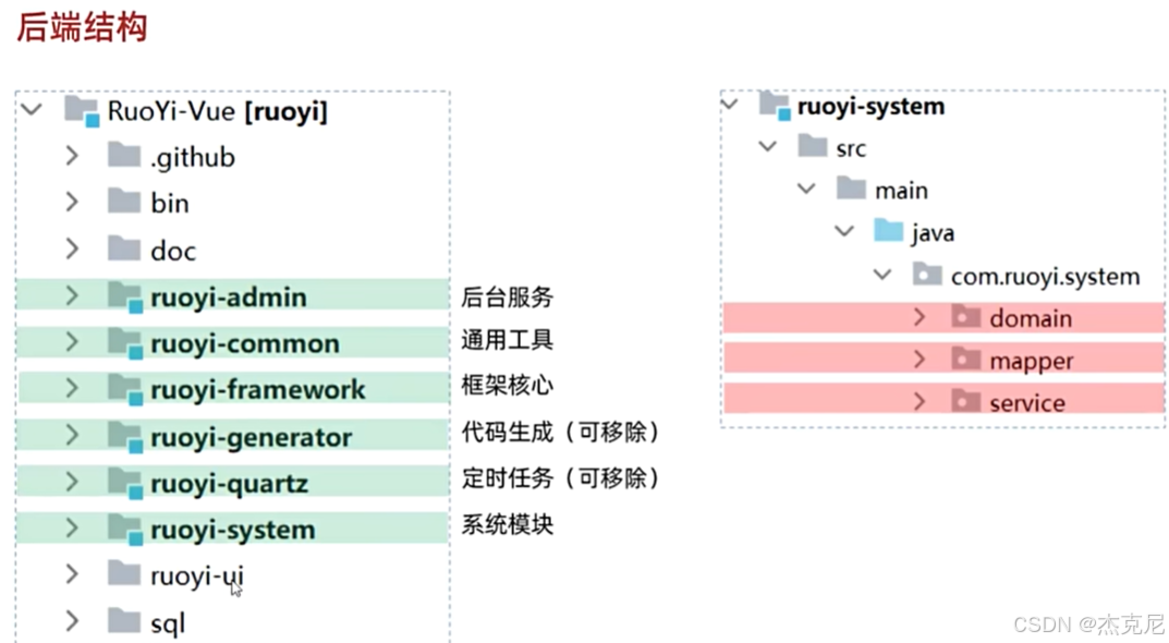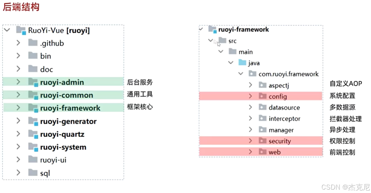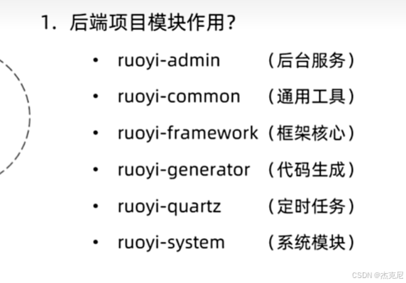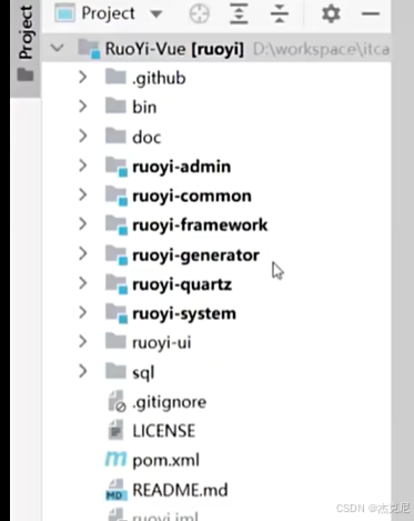 后端有admin(后台服务),common(通用服务),framework(框架核心),generator(代码生成),quartz(定时生成),system(系统生成)
