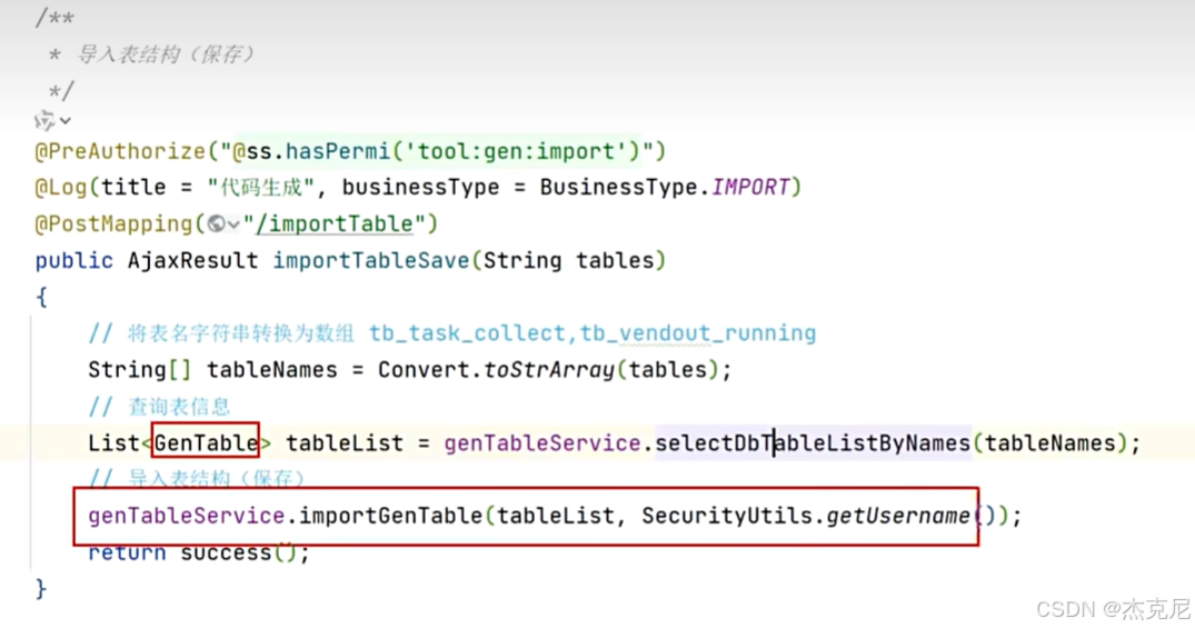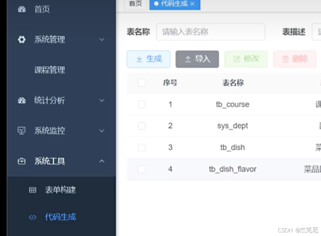 2然后在若依的系统工具中的代码生成中导入表名称