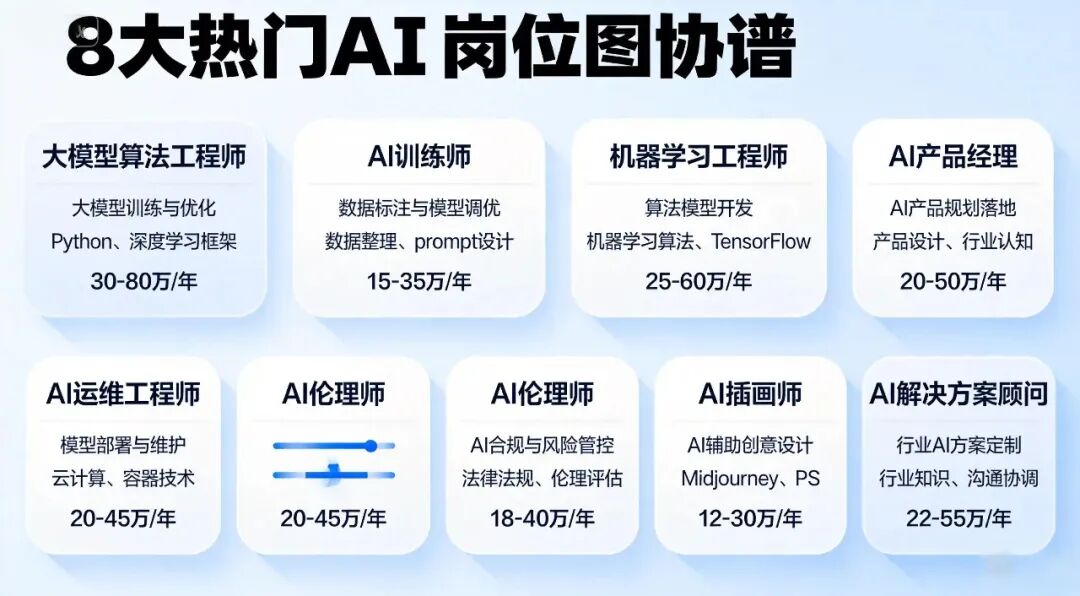 - AI训练师、智能运维工程师、AI产品经理,年薪30-60万