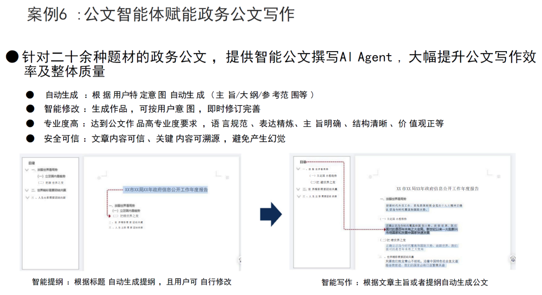 政务公文智能体针对政务场景的二十余种公文题材,提供智能化的公文撰写服务,大幅提升政务公文写作的效率与专业质量。