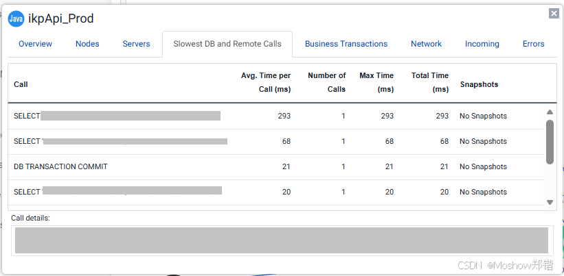 | 2. 数据库调用分析 (Database Calls) | JDBC 调用耗时、Top SQL | 在API的Snapshot里,可以直接看到对应数据库调用的耗时。如果这一步占比高,说明问题在数据库侧。此时应记录下具体的SQL语句。 |