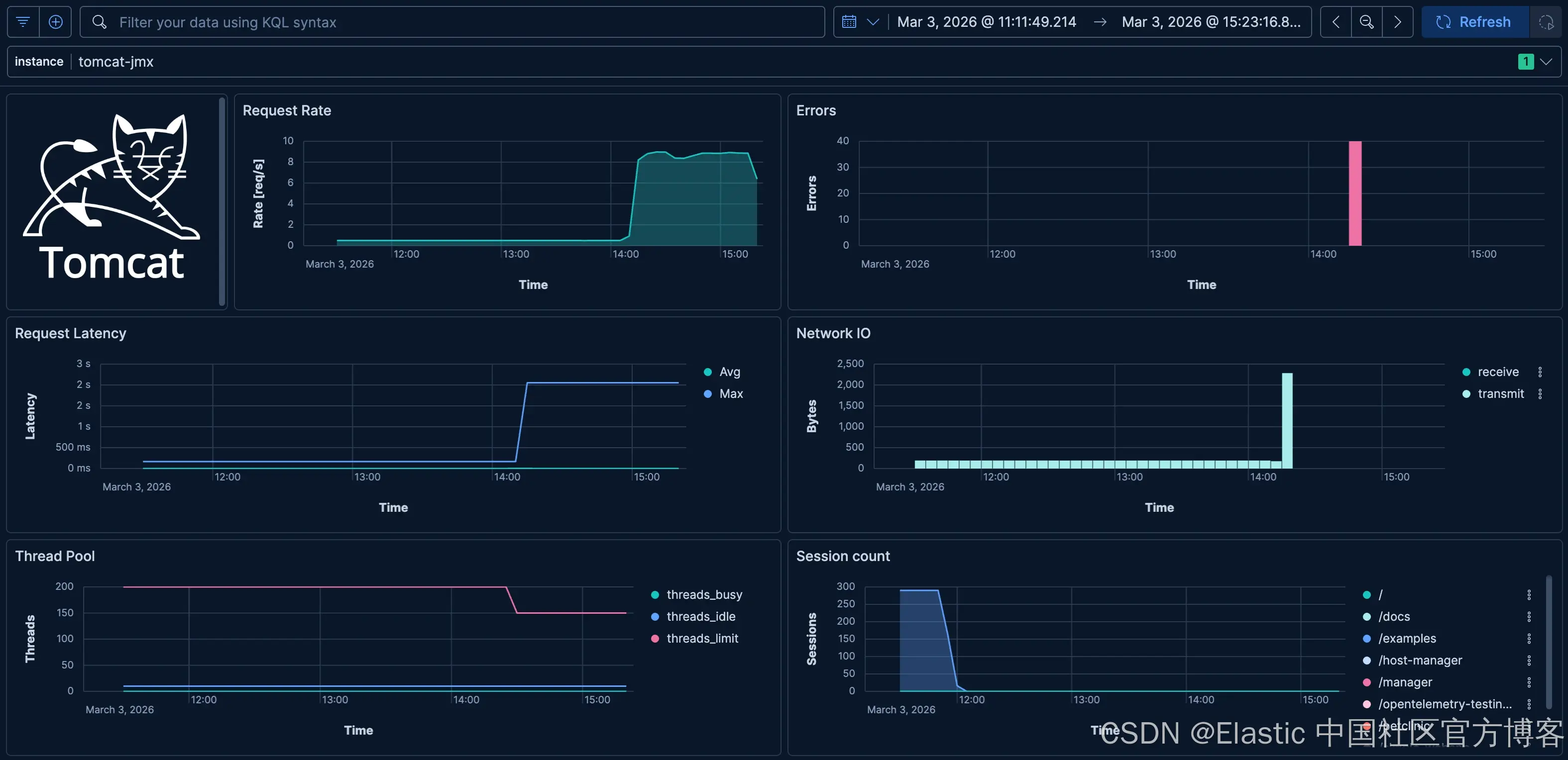 下面是一个示例仪表板,用于可视化 Apache Tomcat 的典型 JMX 指标: