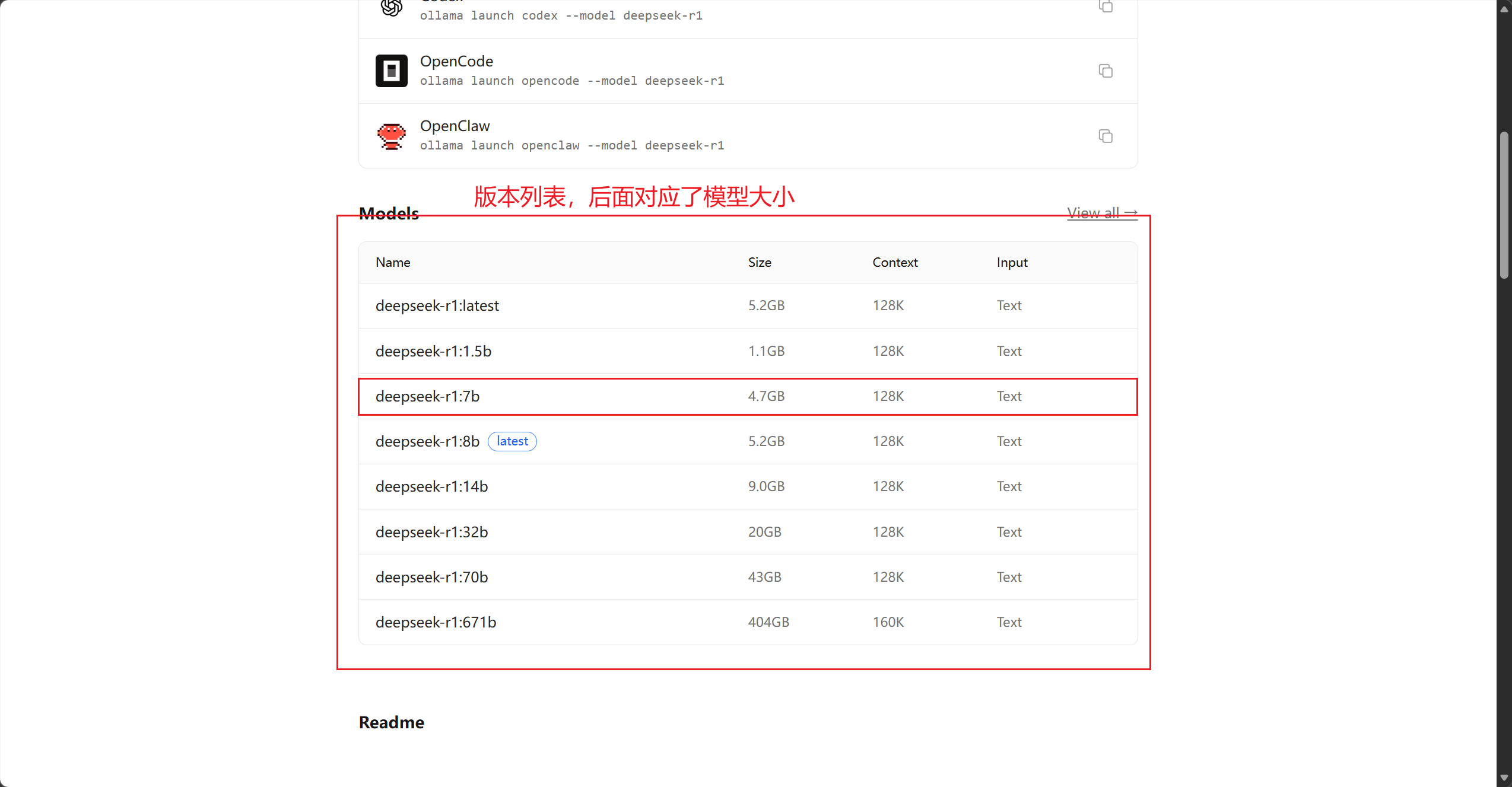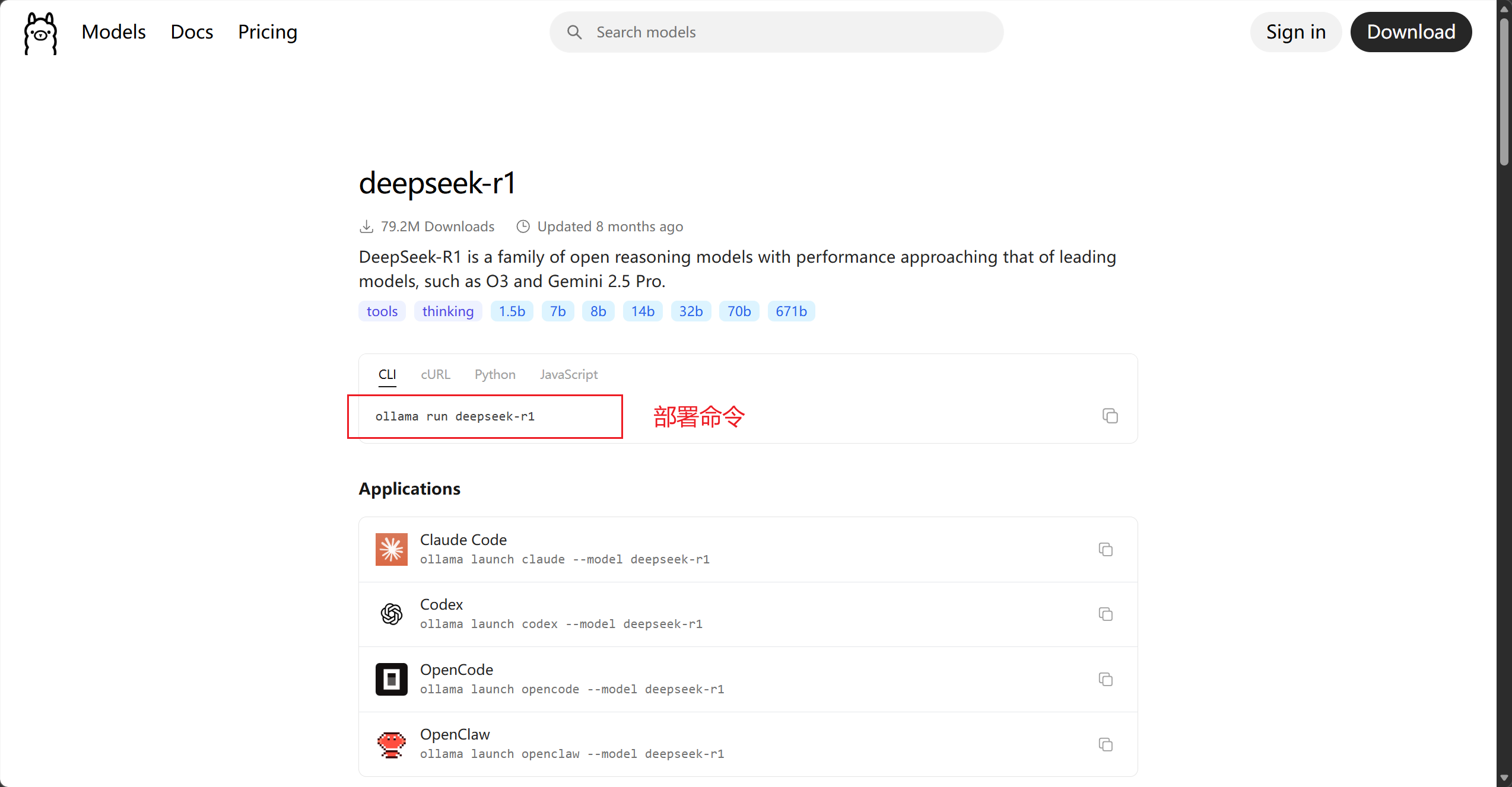 页面列举了部署命令和模型的版本,根据自身电脑配置,配置较低可以选择1.5b版本,一般建议7b和8b版本