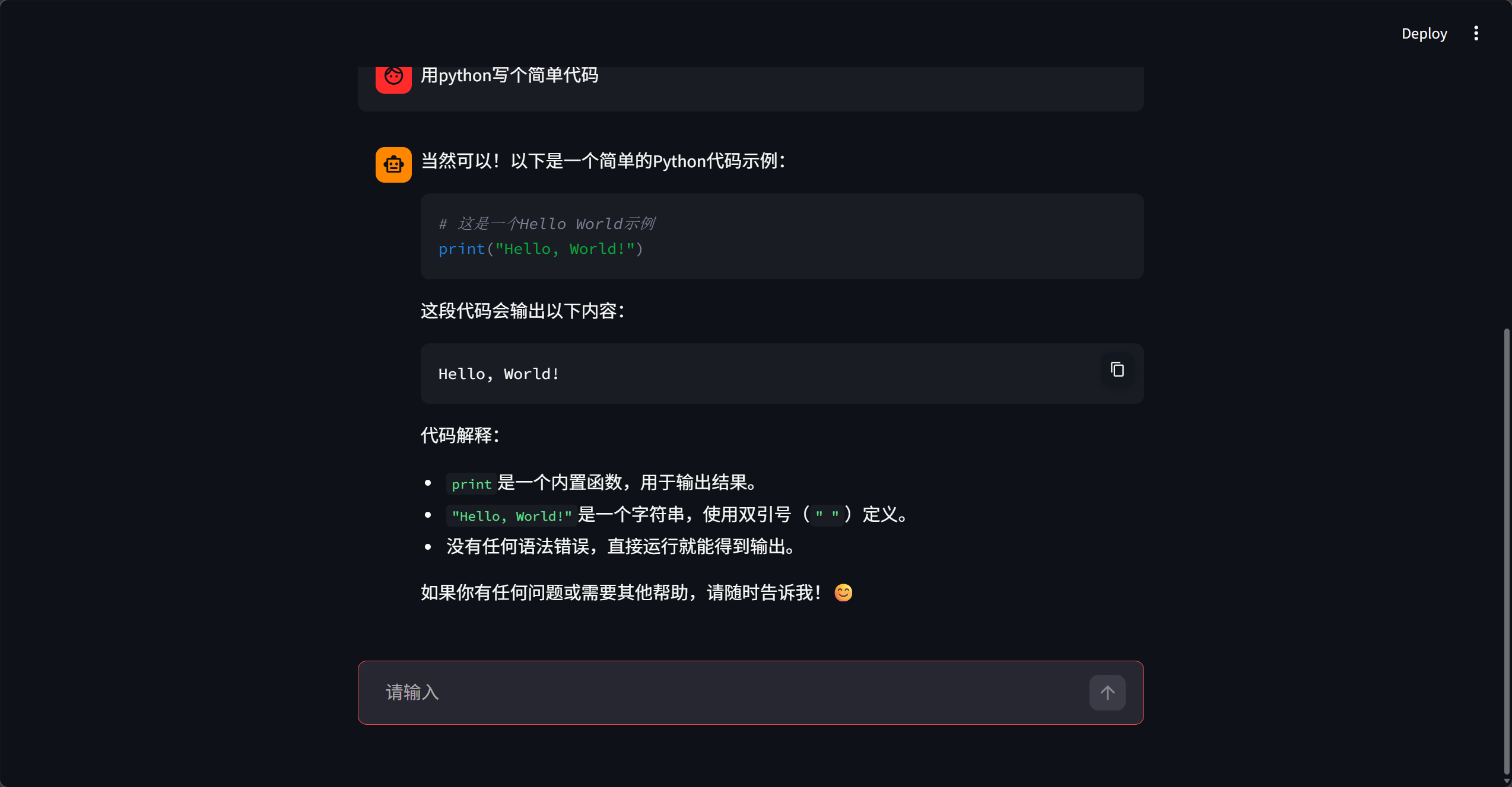 由于我之前已经完成了下载,所以此处直接进入问答界面,第一次部署会有个下载过程,比较慢,也需要科技