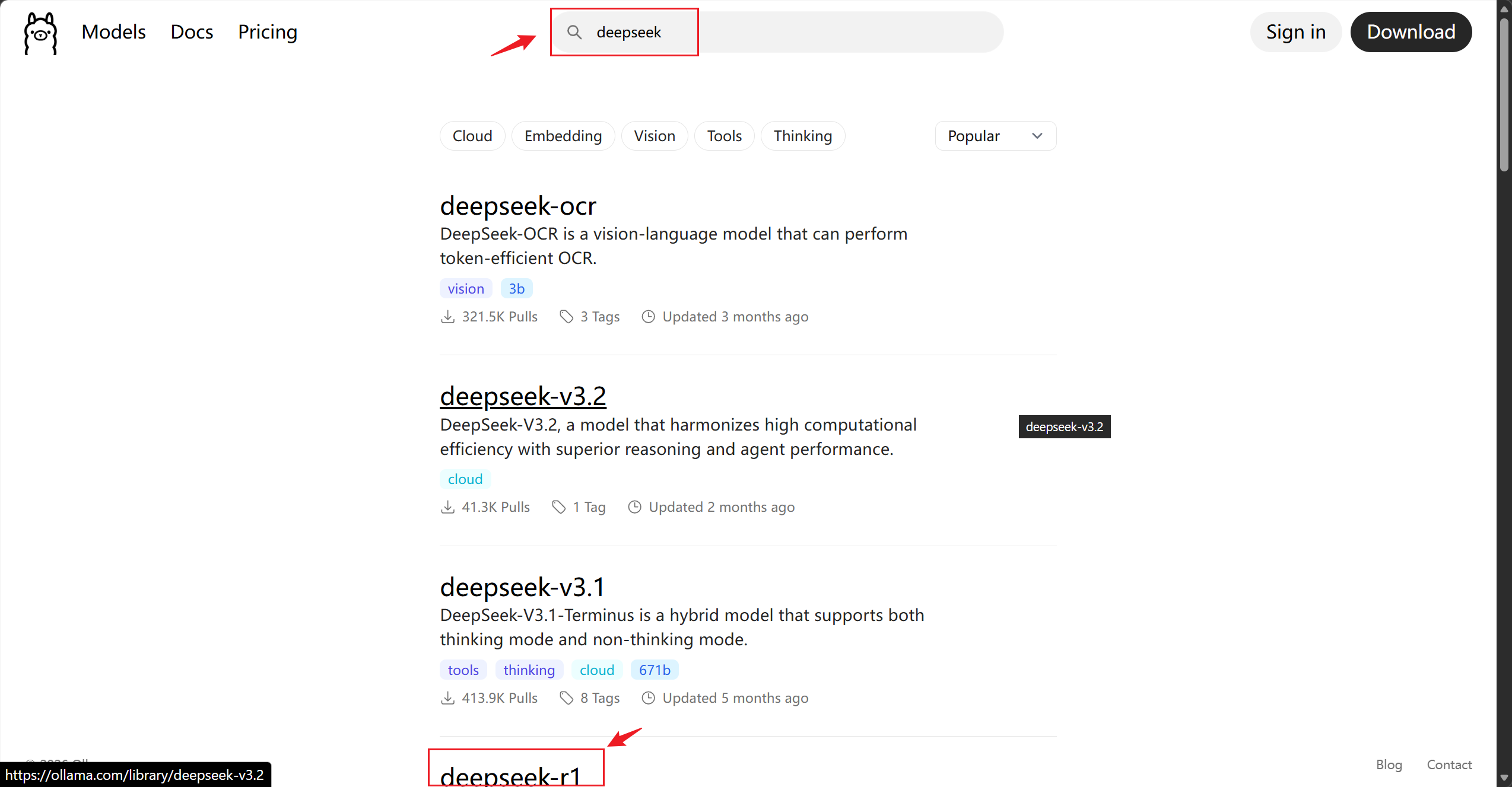 此处列举了许多可用的大模型,本文以deepseek-r1:7b版本为例(具体可结合自身电脑配置)