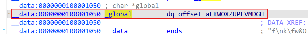 可以看到这并不是我们想要的数据,这说明 global 本身并不是直接存放数据的数组,而是一个指针(dq 表示 8 字节的地址),它指向另一个地方,那里才是真正的数据。这个指针指向的标号是 aFKWOXZUPFVMDGH,我们需要再双击 aFKWOXXZUPFVMDGH(或者按 Enter 键),就能跳转到真正的数据定义处。