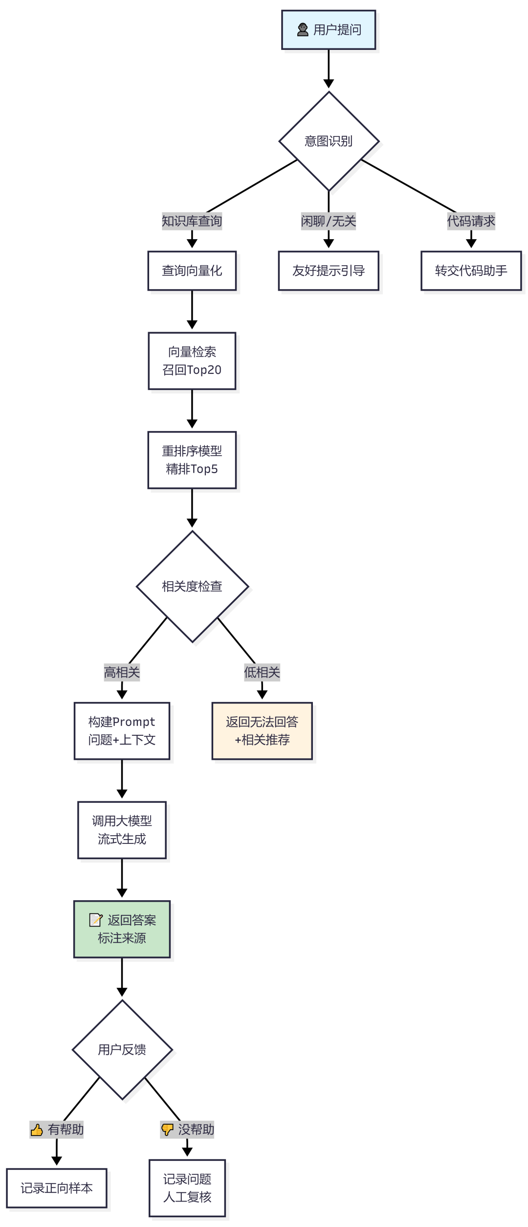 后来我加了一个意图识别层,先判断用户的问题是否属于知识库问答的范畴: