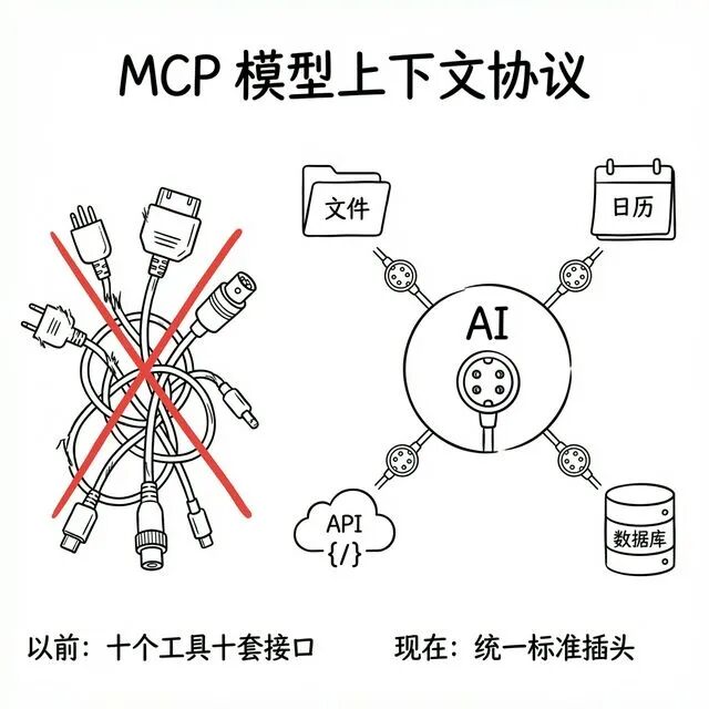 没有统一协议时,每接一个系统都要单独写一套对接代码。用了 MCP 后,AI 接日历、文件、数据库、内部 API 的流程可以统一,迁移和维护都更省事。