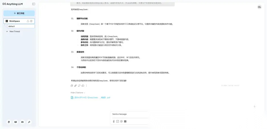 上传文档资料到知识库,并挂载到指定的工作区进行对话,输出的内容便会依据你当前工作区的资料进行回答