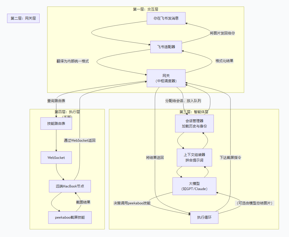 数据回流:截图结果原路返回:执行层 → 智能体层(可能由模型对图片做简单总结) → 网关层 → 交互层(飞书适配器将图片发回给你)。